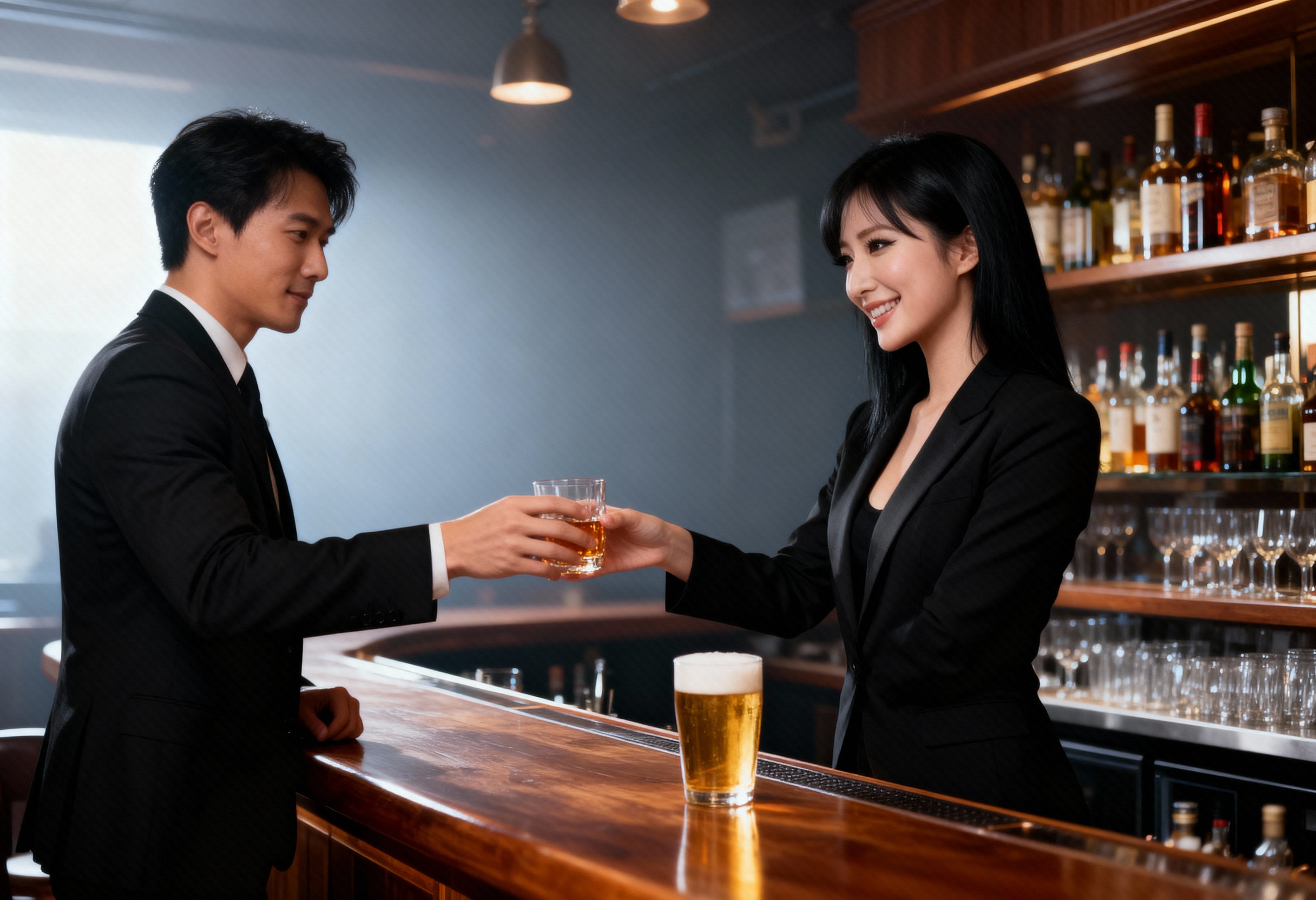 バーで握手するフォーマルな服装をした男女を横から撮ったフォトリアルな写真。画像の左側にいる男性は、黒いスーツと白いシャツを着て、木製のバーカウンターの後ろに立って、目の前にビールのグラスを持っています。彼は20代後半に見え、短い黒髪で真剣な表情をしています。右側の女性はバーの後ろに立っていて、長い黒髪を背中に流し、顔にかすかな笑みを浮かべている。彼女は黒いブレザーを着ており、フレンドリーなジェスチャーで手を組んでいます。背景には、さまざまなボトルやグラスが並べられた棚のある薄暗いバーが示されており、居心地の良い雰囲気を作り出しています。
