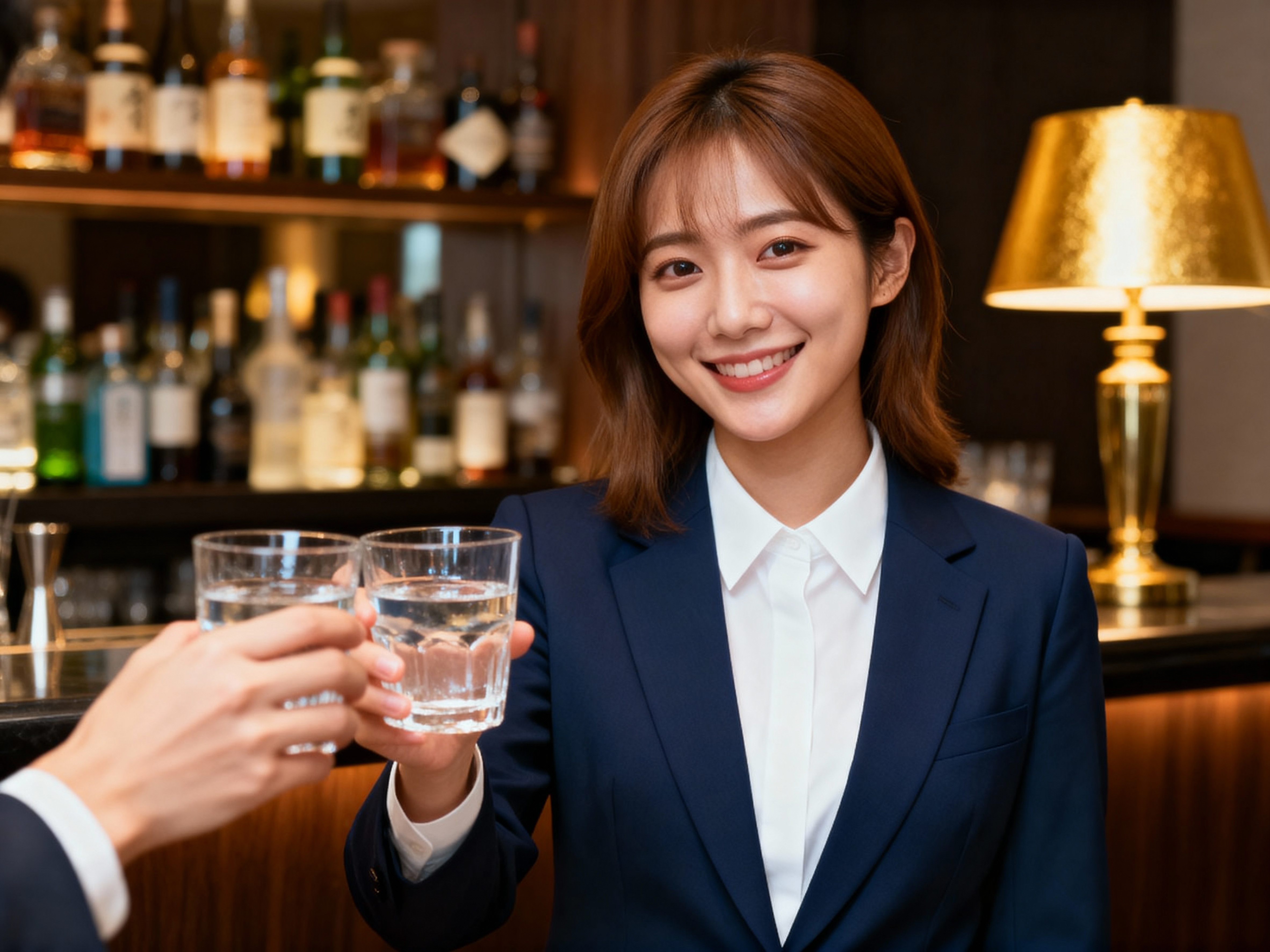 バーカウンターの前で水の入ったグラスを 2 杯持つウェイトレスを正面カメラのアングルから写実的に撮影し、背後には酒瓶の背景がぼやけています。長い茶色の髪をした若いアジア人女性が、ネイビーブルーのブレザーと白いシャツを着て、画像の中央に立って、カメラに向かってわずかな笑みを浮かべています。彼女は20代前半と思われ、スリムな体と人懐っこい表情をしています。彼女の茶色の目は視聴者をまっすぐに見つめており、ネイビーブルーのスーツのジャケットの下に白いシャツを着ています。前景では、男性の手が左側から彼女に向かって伸びており、水の入ったグラスを持っており、友好的なジェスチャーを示唆しています。照明は柔らかく温かみがあり、居心地の良い雰囲気を作り出し、背景には右側に金色のランプが付いた薄暗いバーがあり、シーンに洗練されたタッチを加えています。