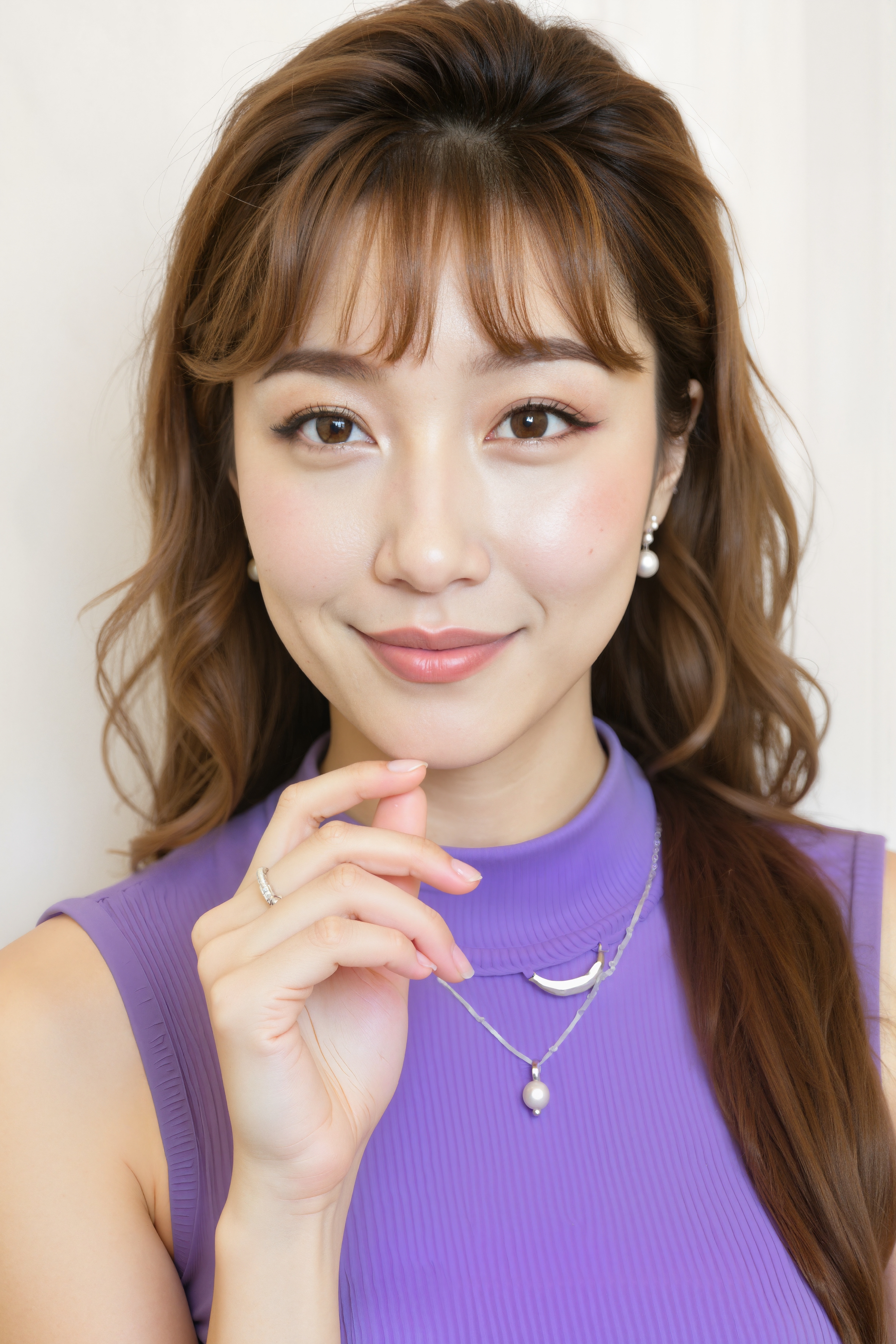 ウェーブのかかった茶色の長い髪と白い肌を持ち、紫色のノースリーブのトップと三日月のペンダントが付いた銀のネックレスを身に着けている若い女性のクローズアップの肖像画。彼女は右手を顎に当ててカメラに向かって直接微笑み、左手にはダイヤモンドの指輪が飾られています。女性は10代後半か20代前半のように見え、顔にはわずかに笑みを浮かべています。彼女は大きく表情豊かな茶色の目をしており、最小限の化粧をしています。背景は無地の明るい色の壁で、女性の顔立ちに微妙なコントラストを与えています。照明は柔らかく自然で、彼女の白い肌とジュエリーの繊細なディテールが強調されています。