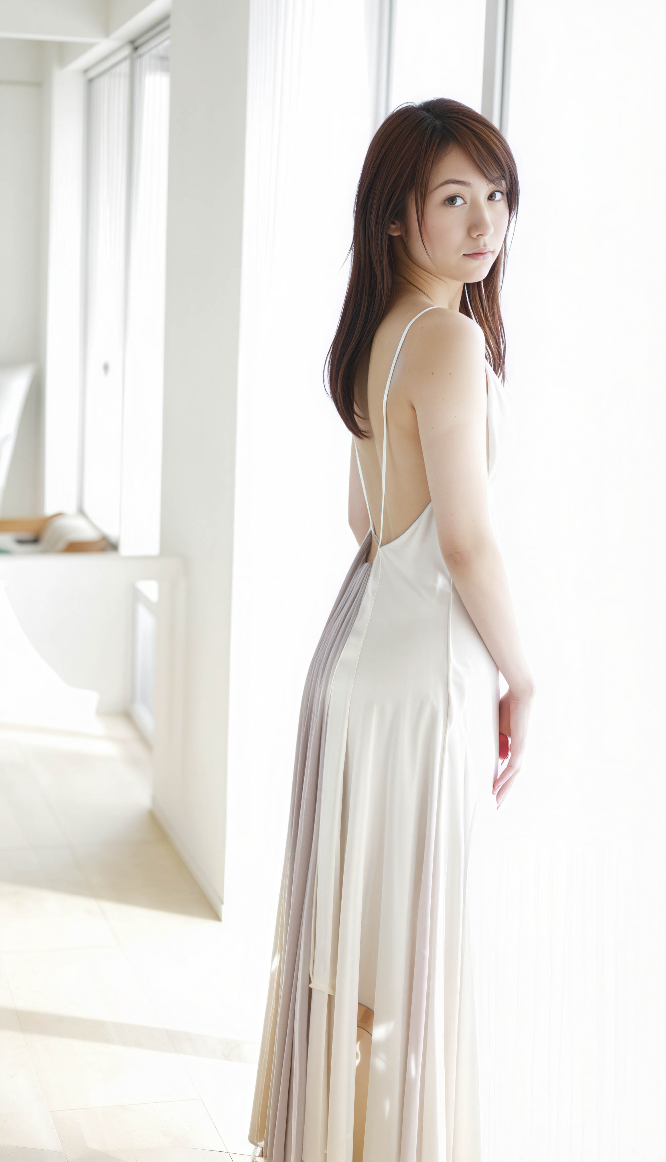 白いロングドレスを着てモダンなインテリア空間に立つ若い女性を横から見た写真のようにリアルな写真。この画像には、白い壁と大きな窓を備えたシンプルなインテリアも示されています。画像の中央では、白い肌と長い茶色の髪をした 20 歳のアジア人女性が、視聴者に背を向けて立っており、中立的な表情でカメラを直接見つめているように見えます。彼女は、細いストラップとローカットのネックラインが付いた、白い流れるようなドレスを着ており、裸の肩と小さな胸が露出しています。彼女の髪はゆるやかなウェーブに整えられ、背中に流れて顔を縁取ります。彼女の目は茶色で、表情は中立的で、口元にはわずかな笑みが浮かんでいます。彼女の体はスリムで、片手を腰に置き、もう一方の手を太ももに当てて立っています。彼女の姿勢は自信に満ちていてリラックスしており、彼女の姿勢は穏やかさと穏やかさの感覚を示唆しています。画像内の照明は柔らかく自然で、彼女の体に優しい影を落とし、彼女の曲線を強調しています。