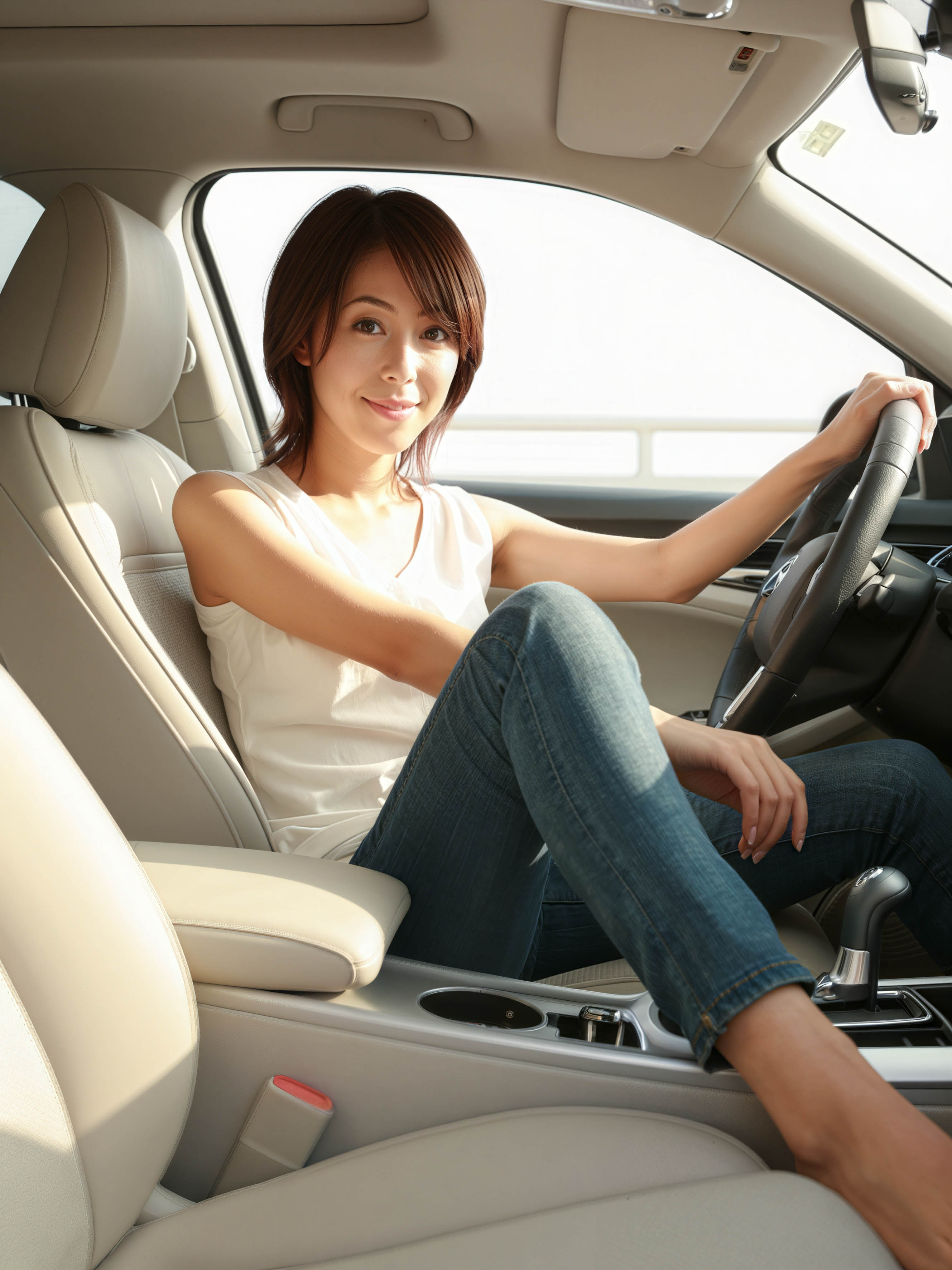 現代の車の運転席に座り、ハンドルを握りながら自信に満ちた笑みを浮かべている若い女性を正面から写実的に撮影したもの。画像には、ベージュの革シートとセンターコンソールのギアシフトを備えた車内も示されています。画像の中央では、短い茶色の髪の20歳のアジア人女性が、白いノースリーブの上着とブルージーンズを着て、足を組んで座っており、顔にはリラックスした表情を浮かべ、わずかな笑みを浮かべてカメラを直接見つめているように見えます。