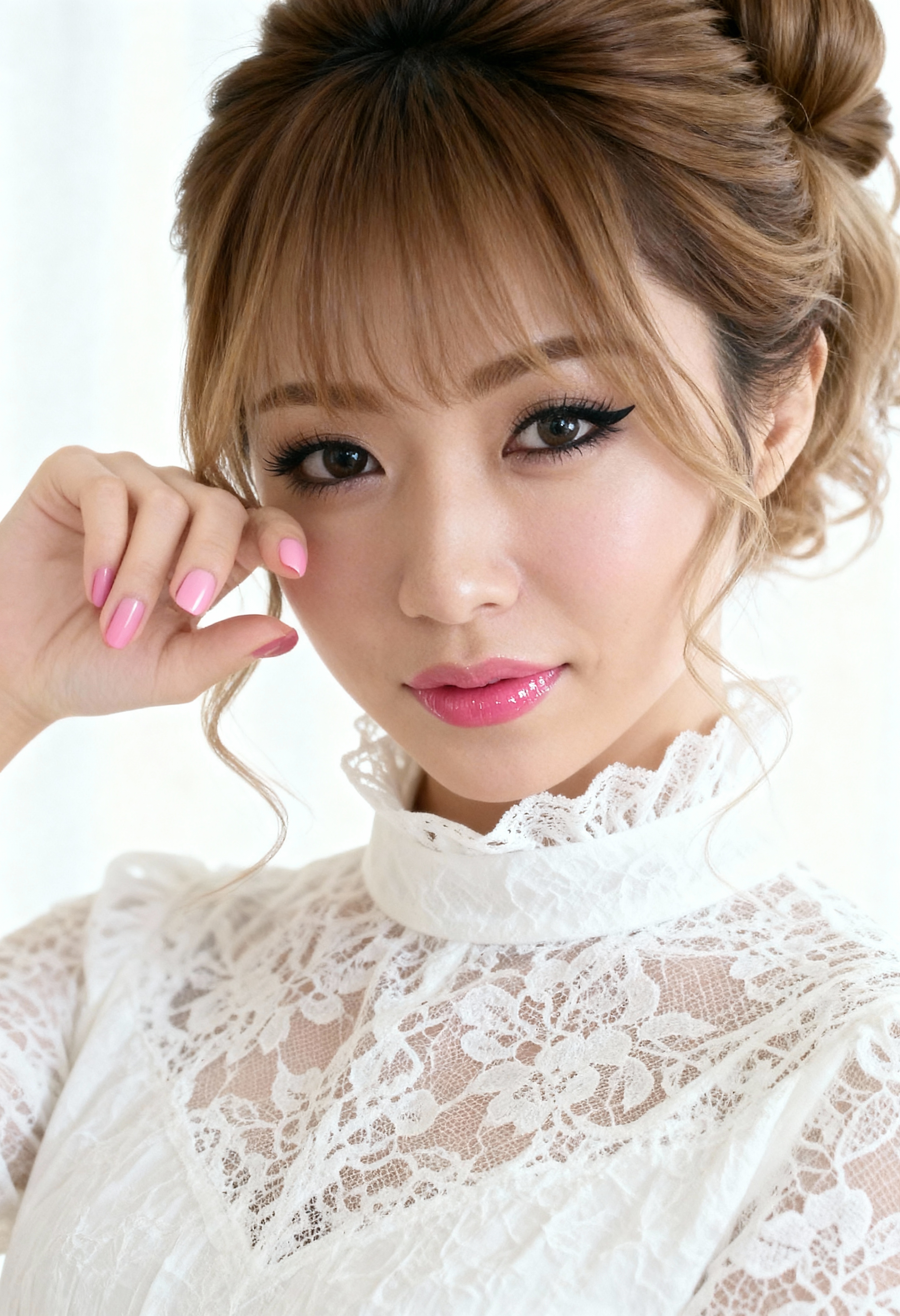 高い襟が付いた白いレースのトップスを着て、ピンクのマニキュアを着た、穏やかな表情とわずかな笑みを浮かべたアジア系の若い女性の接写。彼女は画像の中央に位置し、右手は左頬に置き、左手はピンクのマニキュアをそっと触れています。彼女の茶色の髪は、顔の周りを縁取る緩い束で乱雑なお団子にスタイリングされており、彼女の目はドラマチックなアイライナーとマスカラで強調されています。唇は優しいピンク色に塗られ、中性的な表情でカメラを見つめている。背景は無地の白い壁で、ポートレートにシンプルかつエレガントな背景を提供します。照明は柔らかく自然で、彼女の繊細な顔立ちと衣装の繊細なレースを強調しています。