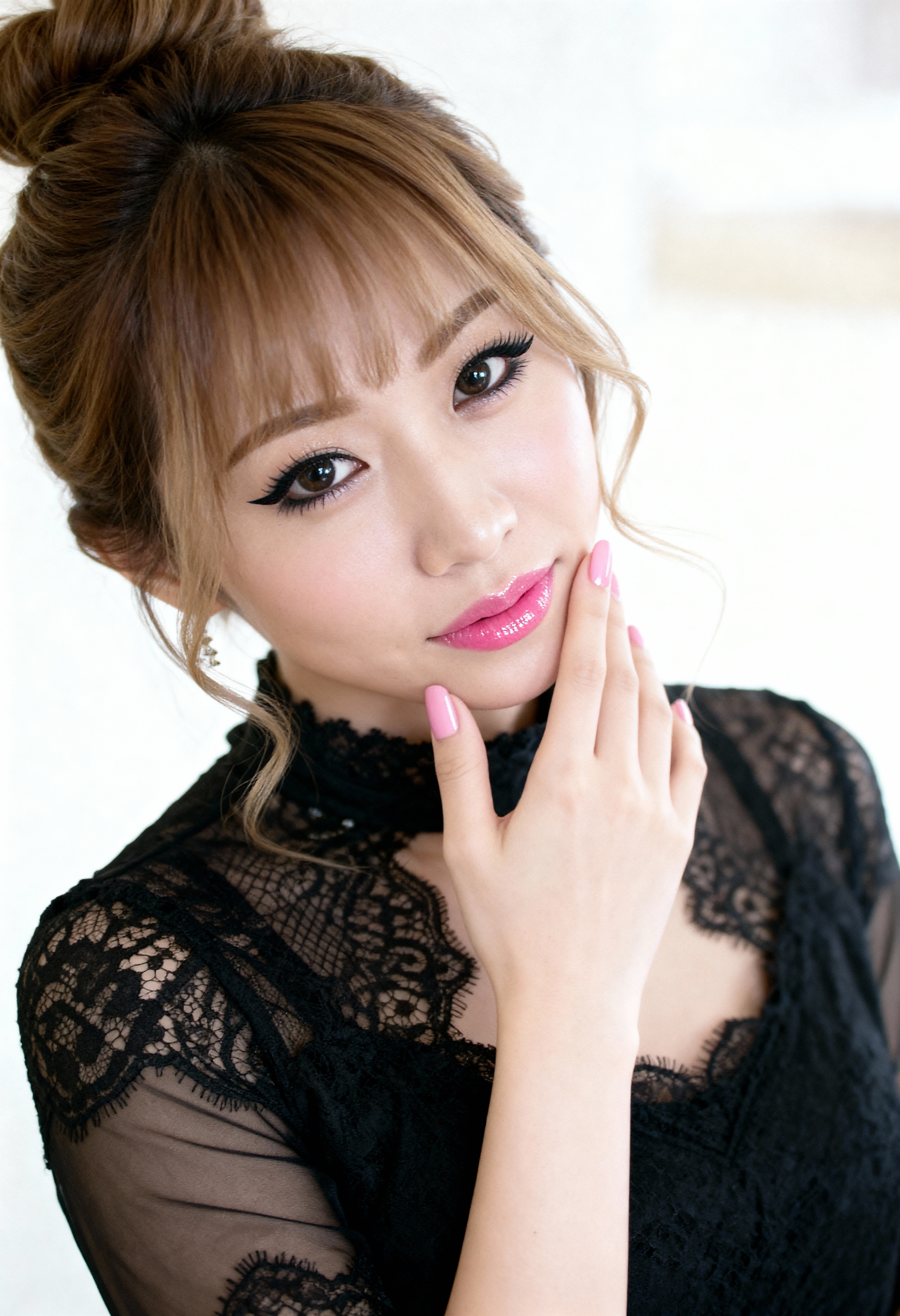黒いレースのトップを着て、乱れたお団子でスタイリングされた、白い肌と茶色の髪を持つ若い女性の写実的なポートレート。彼女は画像の中央に位置し、上半身が視聴者に面し、視聴者をまっすぐに見ています。女性は中性的な表情をしており、ピンクの口紅とつけまつげを付けています。彼女の右手は顎に当てられており、見た目に優雅さを加えています。背景は柔らかくぼやけた白で、女性の繊細な顔立ちに微妙なコントラストを与えています。照明は柔らかく自然で、彼女の繊細な特徴を強調し、静けさを感じさせます。この画像はクローズアップショットであり、見る人は彼女の顔の詳細や髪の質感を見ることができ、プロのポートレートの完璧な例となっています。