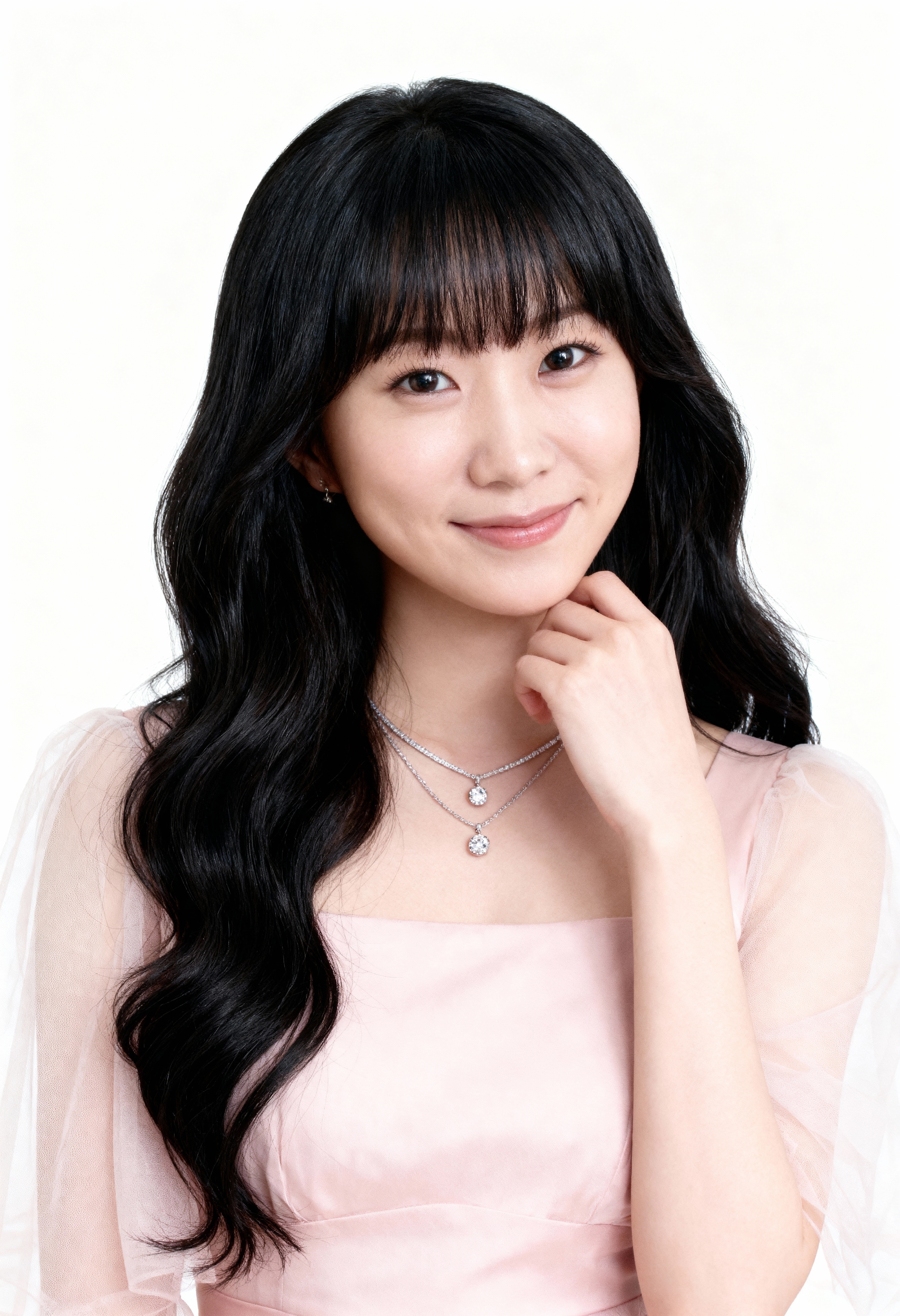 ウェーブのかかった長い黒髪と前髪を持ち、薄手の袖と繊細なネックレスが付いた淡いピンクのドレスを着た若いアジア人女性のポートレート。彼女は画像の中央に位置し、あごを手に乗せて、わずかな笑みを浮かべてカメラを直接見つめています。女性は10代後半か20代前半に見え、色白で微妙な笑みを浮かべている。彼女の黒髪はゆるやかなウェーブで背中に流れ、顔を完璧に縁取っています。彼女の目は印象的な茶色で、ハート型のペンダントが付いた繊細なシルバーのネックレスなど、最小限のジュエリーを身に着けています。背景は無地の白で、女性のエレガントな服装にシンプルかつエレガントなコントラストを提供します。画像はおそらくポートレートカメラの角度から撮影されたプロの顔写真であり、照明が柔らかく均一で、彼女の特徴を強調し、彼女の顔をさらに美しく見せています。