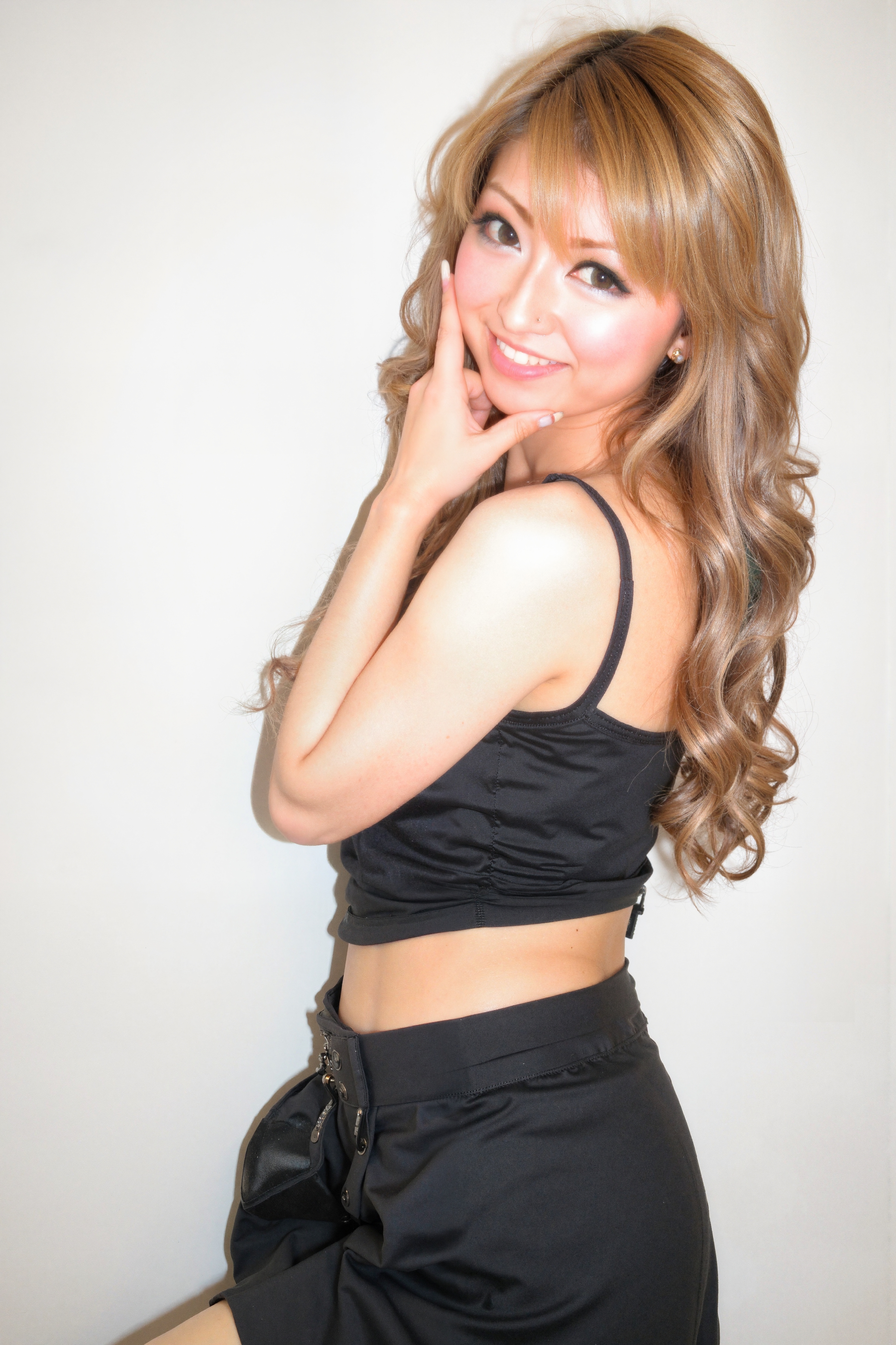 黒いクロップトップと黒いタイトなスカートを着て、わずかな笑顔で自信を持ってポーズをとる若い女性を横顔カメラのアングルから撮影した写真。画像にはまた、10代後半か20代前半と思われる、ウェーブのかかった茶色の長い髪と白い肌をした若いアジア人女性が画像の中央に立って、片手を顎に当て、もう一方の手を頬に当ててポーズを取り、笑顔でカメラを直接見つめている様子も映っている。彼女はスリムな体をしており、濃いアイライナーとマスカラを含む最小限のメイクをしています。女性は無地のライトグレーの背景に立っていて、照明は柔らかく自然で、彼女の特徴を強調しています。彼女の茶色の髪は緩いカールでスタイリングされ、背中に落ちて顔を縁取っています。彼女は、裸の肩と腹部を見せるクロップド丈の黒のタンクトップを着ており、サイドにジッパーが付いているハイウエストの黒のショートパンツを組み合わせています。全体的な美しさはシンプルかつミニマルであり、女性の自信とリラックスした表情に焦点を当てています。