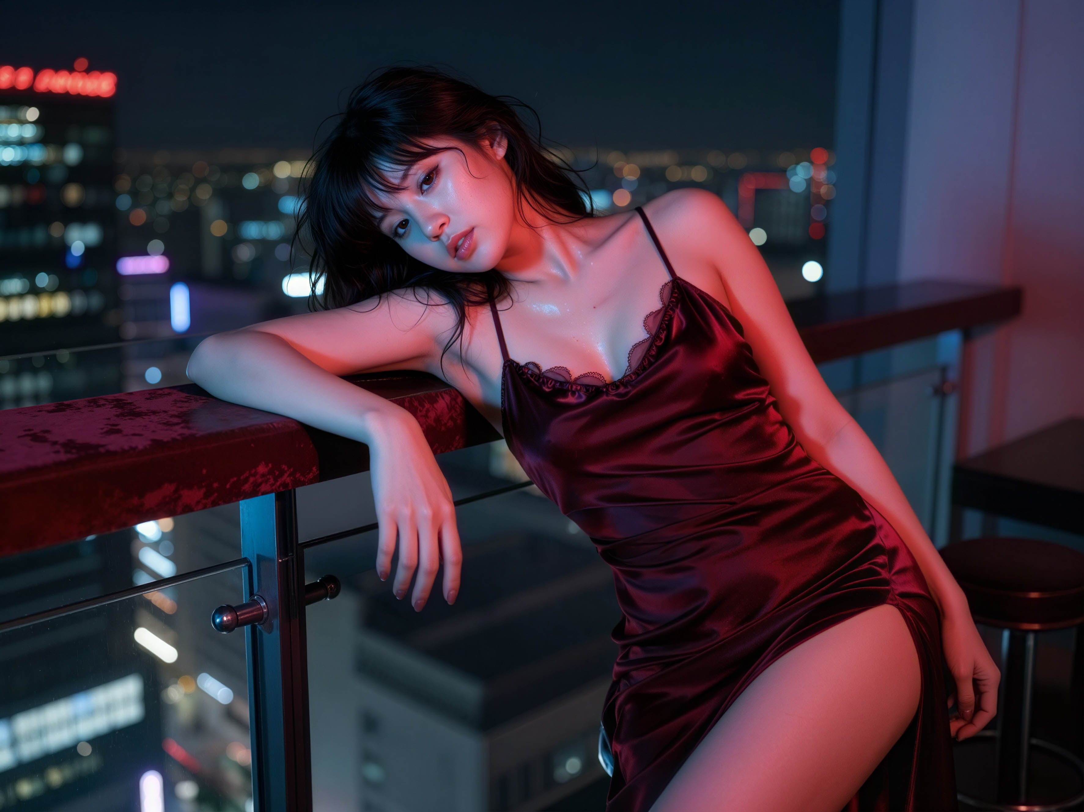 ネオンに照らされた街並みを背景に、豪華な赤いサテンのスリップ ドレスを着た若い女性が夜に手すりにもたれかかる様子を横から撮影した写実的な写真。この画像には、ガラス窓を通して見える建物や高層ビルのある薄暗い街並みも示されています。画像の中央では、19歳のアジア人女性が手すりにもたれかかり、官能的な表情でカメラを直接見つめているように見えます。彼女は長くて黒髪で、レースのトリムが付いたタイトなワインレッドのサテンのナイトガウンを着ています。彼女のスリムな体は、スリップから見える裸の肩と中くらいの大きさの胸によって強調されています。唇は少し開き、真剣な表情を浮かべている。照明はドラマチックで、青と赤の色合いがムーディーな雰囲気を作り出しています。