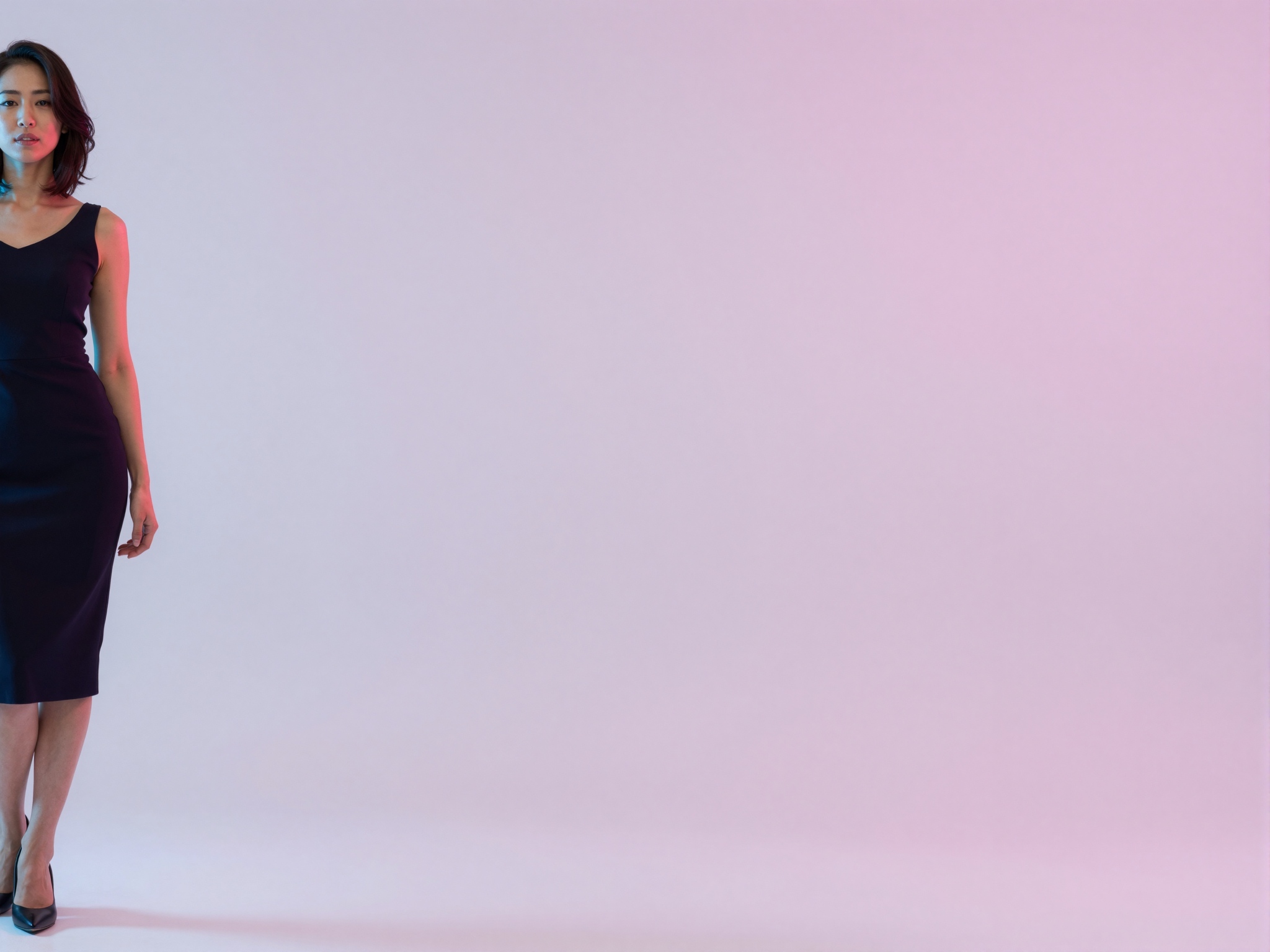 エレガントなドレスのシルエットを着た日本人女性が、左端のほぼ隠れた位置にいます。柔らかなピンクから白へのグラデーションと、繊細なダイヤモンド パターンのオーバーレイがフレームの右側を占め、広大な空きスペースが生まれます。シーンは明るくきれいで、バナー テンプレートに最適です。テキスト、文字、数字、書き込み、透かしは一切ありません。高画質でフリーのNightStock素材です。商用利用可能・クレジット表記不要。