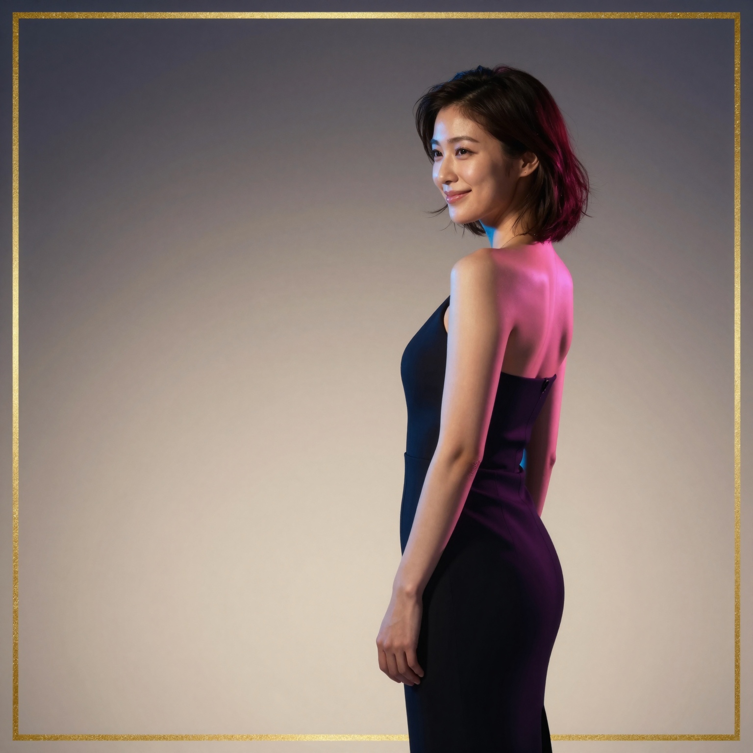美しい日本人女性が右端にいて、背中を半分に向け、ドレスのエレガントなシルエットを見せています。彼女はダークネイビーからゴールドの豪華なグラデーション背景に設定されており、輝きの粒子とエレガントなボーダートリムで強化されています。彼女は洗練された衣装を着ています。この画像は、洗練された魅力と独占性の感覚を呼び起こし、贅沢な労働環境と意欲的なライフスタイルを強調しています。テキスト、文字、数字、書き込。。高画質でフリーのNightStock素材です。商用利用可能・クレジット表記不要。