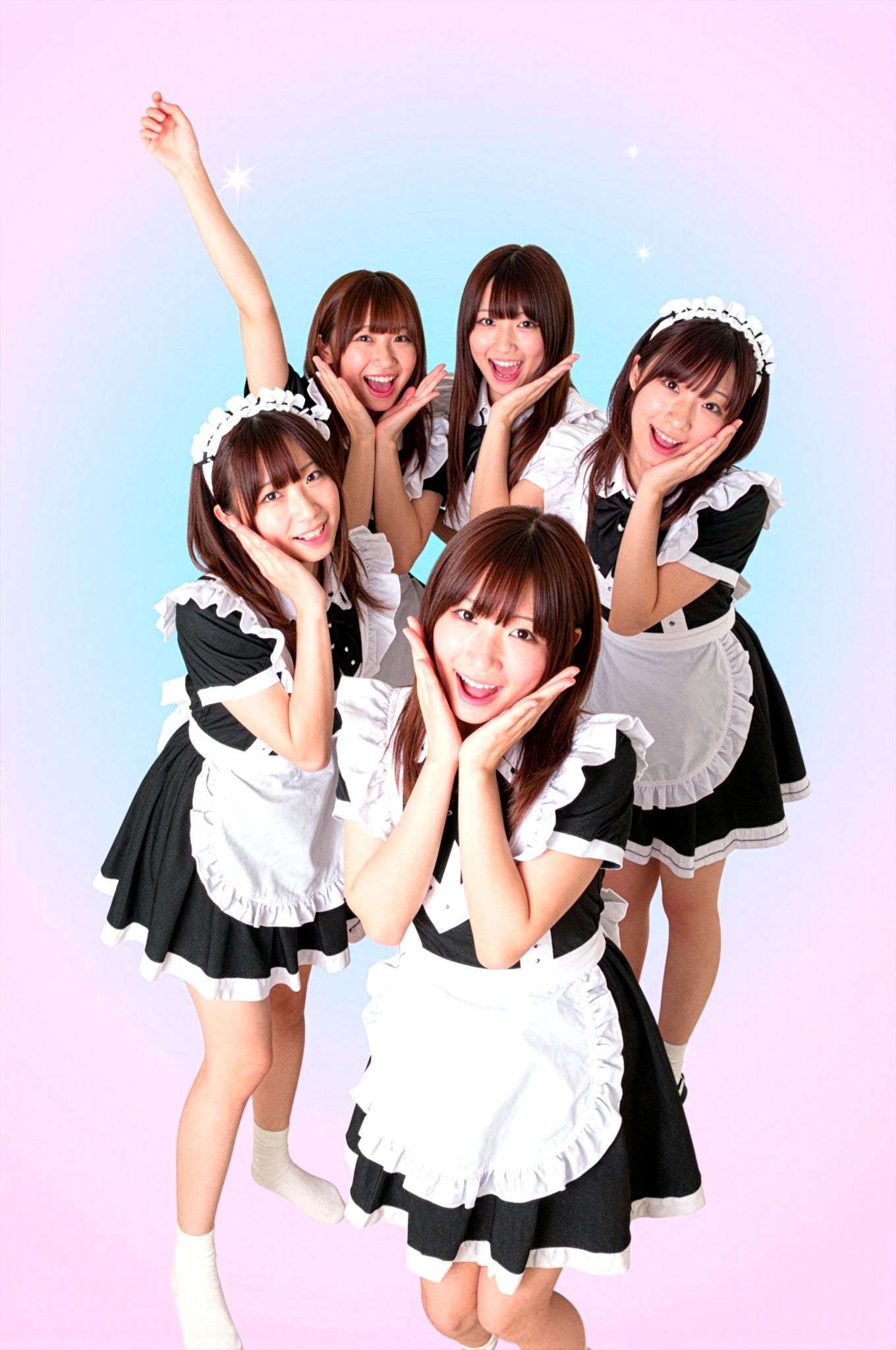 クラシックなフリルのメイド服を着た4人の元気な日本の女の子が、輝く星とポップスタイルの紙吹雪のオーバーレイが施された明るいパステルピンクのグラデーションの上で一緒に陽気なグループポーズをとり、楽しくてエネルギッシュな雰囲気を捉えています。テキスト、文字、数字、書き込み、透かしは一切ありません。高画質でフリーのNightStock素材です。商用利用可能・クレジット表記不要。