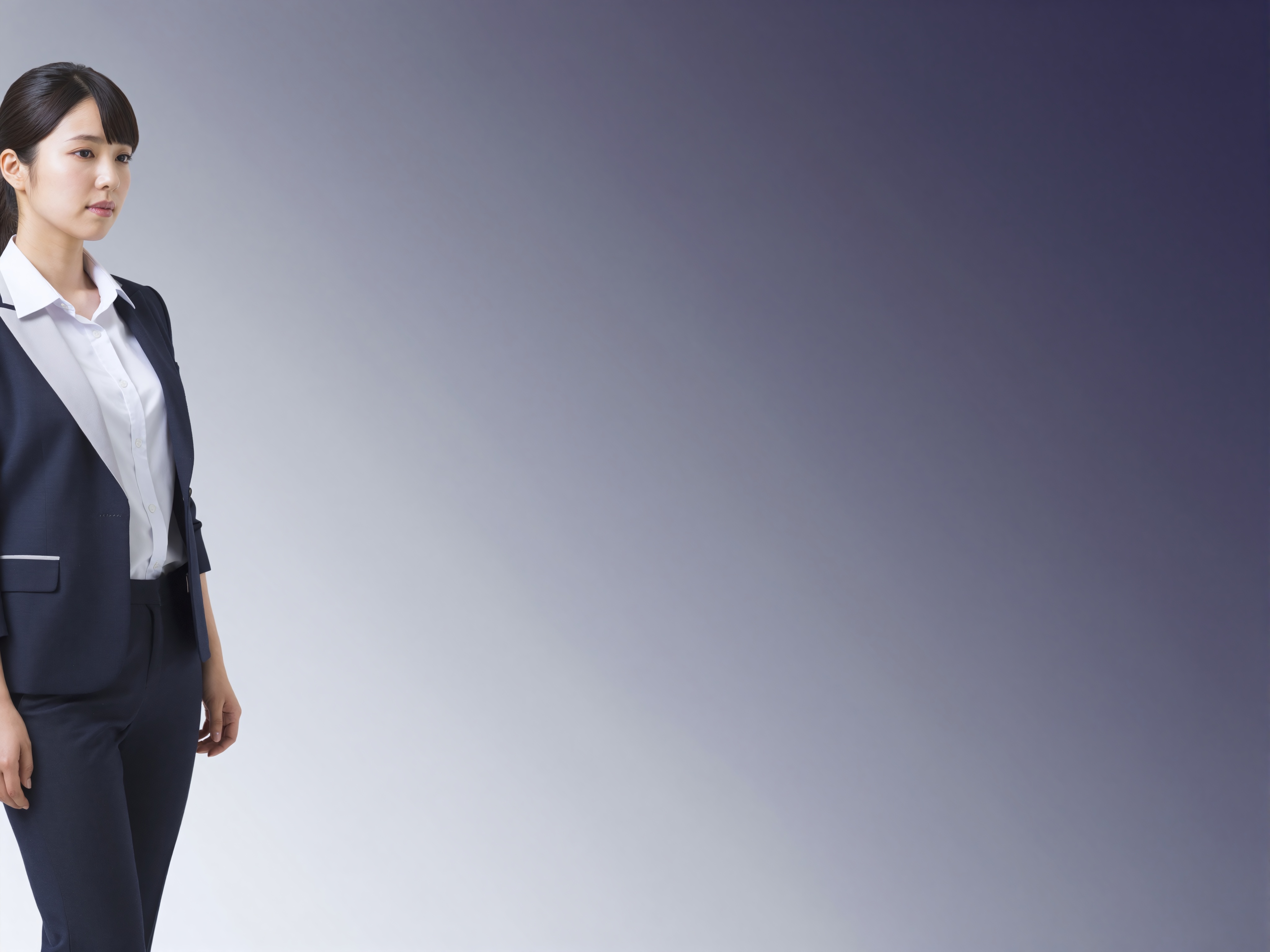 プロフェッショナルでありながらファッショナブルなカジュアルな服装をした美しい日本人女性が左端におり、その右側には滑らかな濃い紫から黒のグラデーションの大きな空きスペースがある小さな人物がいます。彼女は自信に満ちたプロフェッショナルな表情を浮かべており、良好な労働条件を示唆しています。テキスト、文字、数字、書き込み、透かしは一切ありません。高画質でフリーのNightStock素材です。商用利用可能・クレジット表記不要。