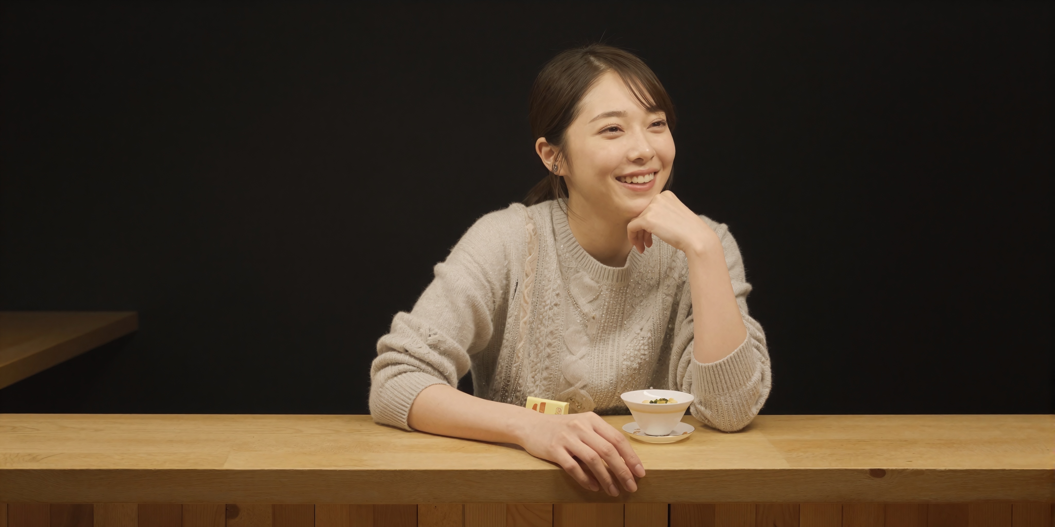 客の視点から見た、親密なスナックバーのカウンターに無造作に寄りかかる美しい日本人女性。温かみのある木の色調と居心地の良い夜の雰囲気が特徴です。カジュアルだけど上品なセーターにアクセサリーを合わせ、自然なリラックスした笑顔でフレンドリーな隣人の雰囲気を醸し出しています。テキスト、文字、数字、書き込み、透かしは一切ありません。高画質でフリーのNightStock素材です。商用利用可能・クレジット表記不要。