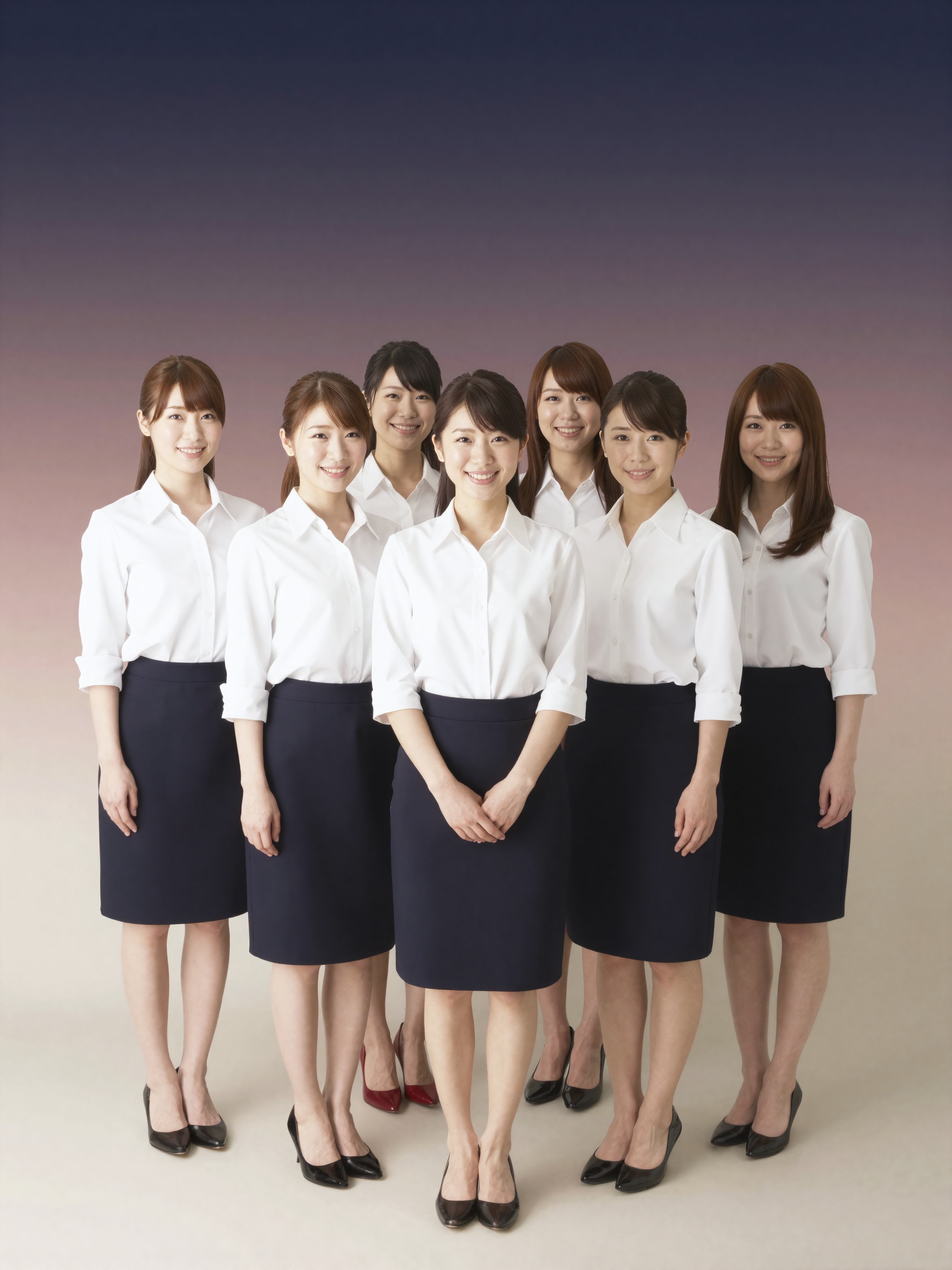 6 人の女性のグループが、おそろいの白いブラウスとダーク色のスカートを着て立ち、コーディネートされたプロフェッショナルな雰囲気を醸し出しています。ダークネイビーの背景にローズピンクのアクセント照明と散在するグリッター粒子が背景に設定されており、暖かく魅力的でありながら豪華な雰囲気を醸し出しており、テキスト、文字、数字、書き込み、透かしは一切ありません。。高画質でフリーのNightStock素材です。商用利用可能・クレジット表記不要。