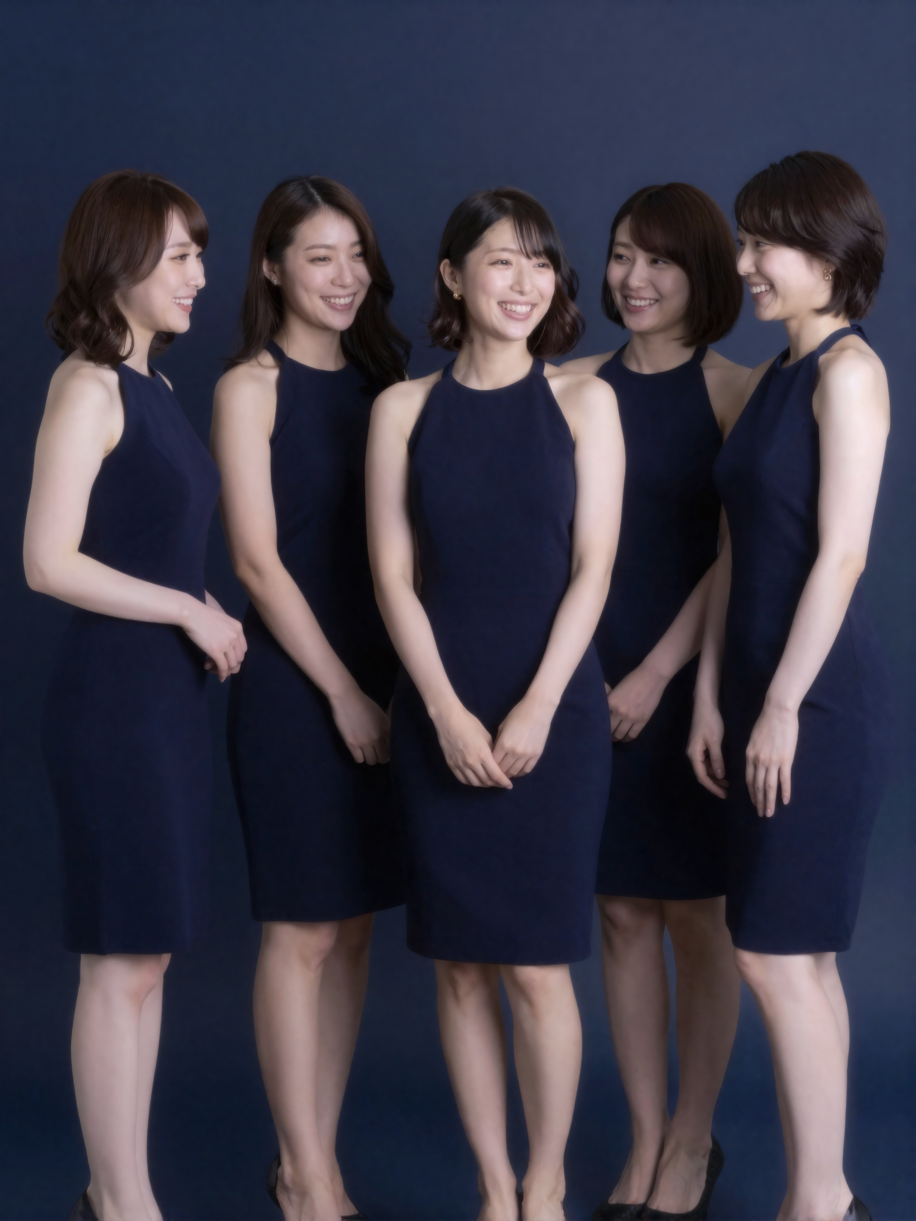 上品なネイビーブルーのホルタードレスを着て、洗練されたアクセサリーを付けた5人の女性が集まっています。ダークネイビーの背景にローズピンクのアクセント照明と散在するグリッター粒子が豊かで魅力的な設定を提供し、テキスト、文字、数字、書き込み、透かしは一切ありません。。高画質でフリーのNightStock素材です。商用利用可能・クレジット表記不要。