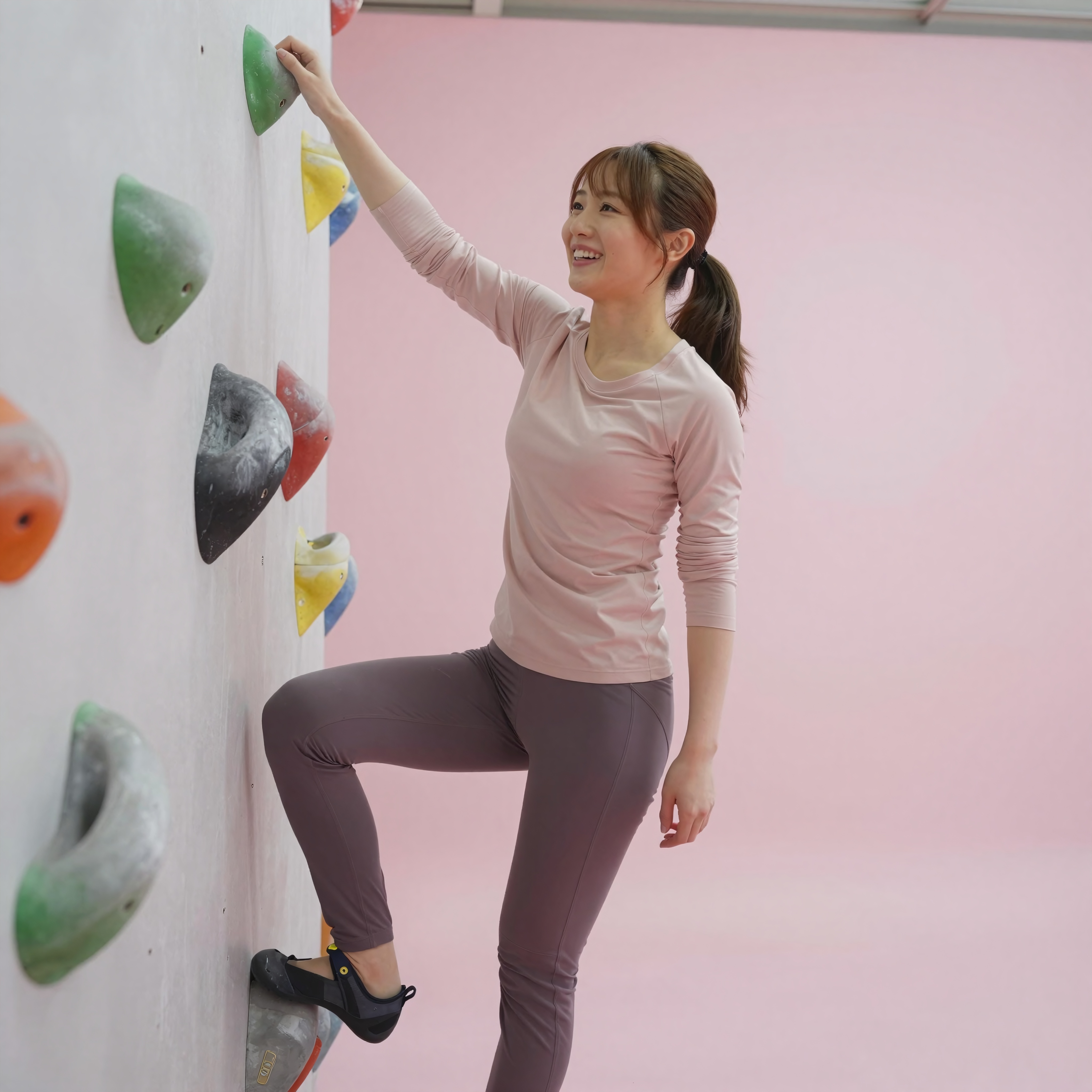 カラフルなホールドと高い天井のあるロック クライミング ジムで、長袖のクライミング シャツと耐久性のあるクライミング パンツを着た日本人女性が、高い窓からの自然光を受けながら、慎重な足元で、冷静かつ戦略的な表情で壁を降りています。 (SFW: 胸の谷間なし、過度の肌の露出なし、SFW ルールに従って完全着衣)。高画質でフリーのNightStock素材です。商用利用可能・クレジット表記不要。