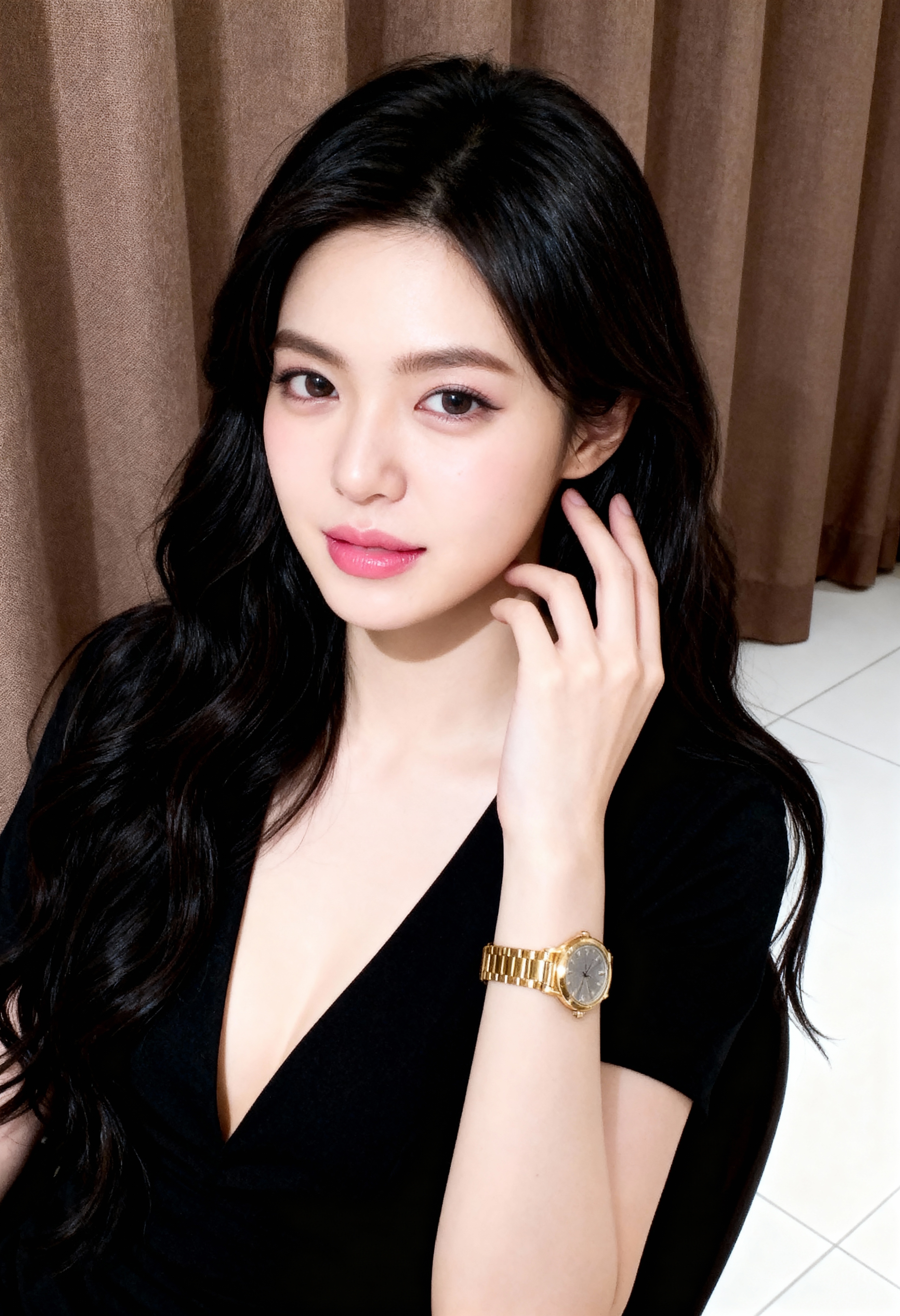 ウェーブのかかった長い黒髪と心地よい表情をした若い女性が、ネックラインが大きく開いた黒いドレスを着て、金の時計を身に着けている、ポートレート アングルから写実的なポートレート撮影。画像には、彼女の顔のクローズアップと、微妙なピンクの口紅も示されています。画像の中央では、白い肌と濃い茶色の目をした19歳の女性が、中立的な表情でカメラをまっすぐに見ているように見え、あごに手を当てて座っており、わずかな笑みを浮かべて視聴者を見つめています。彼女は右手首に金色の腕時計をしており、それが左手首にも見えています。女性はほっそりした体で最小限の化粧をしており、頬はほんのりと赤くなっています。背景はシンプルなニュートラルトーンの部屋で、ベージュのカーテンと白いタイル張りの床が室内環境を作り出しています。照明は柔らかく自然で、彼女の特徴を強調し、暖かく魅力的な雰囲気を作り出しています。