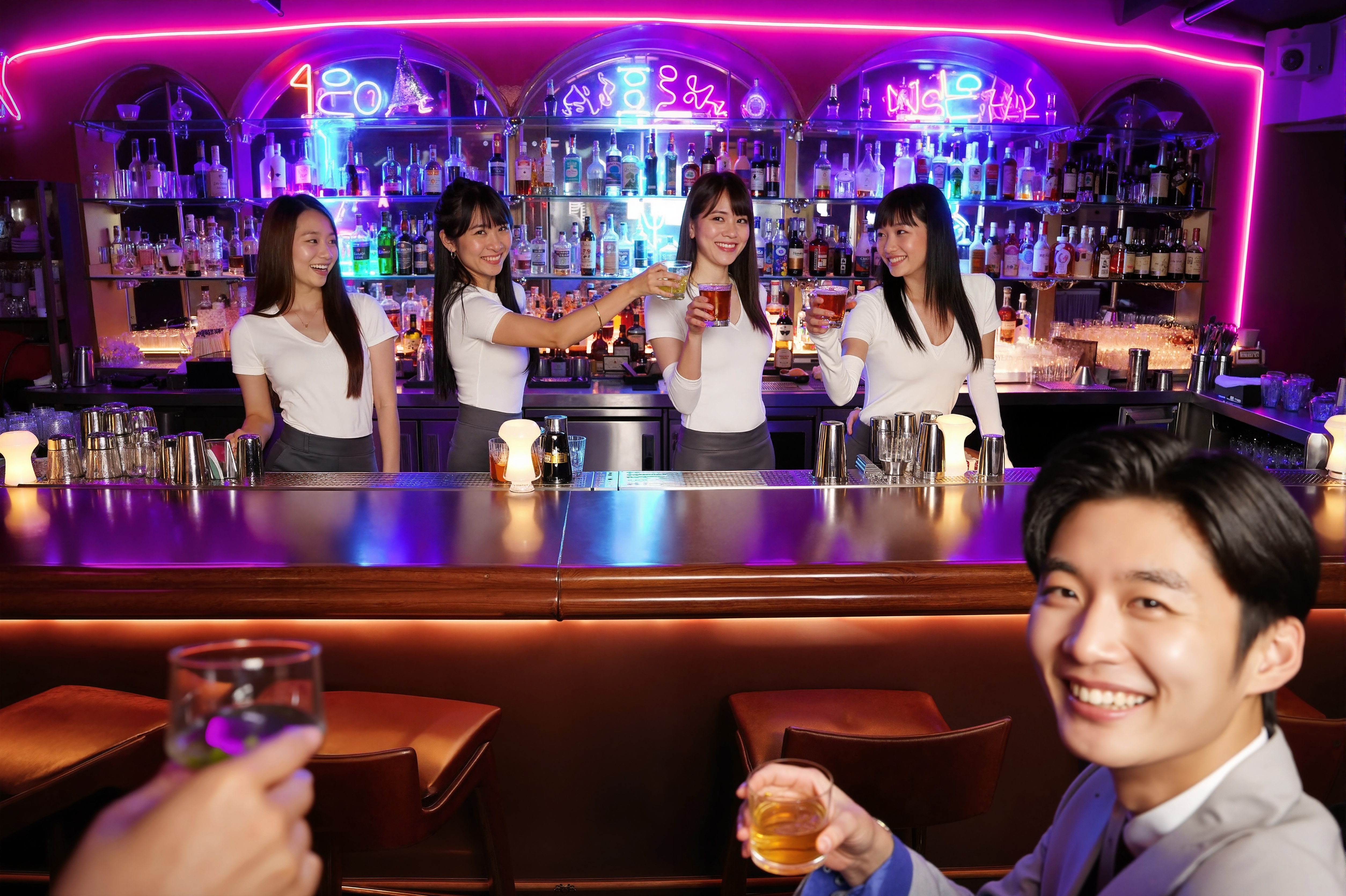 ネオンが輝く活気あるバーとドリンクを楽しむ常連客を正面カメラのアングルから写実的に撮影したものです。バーに座って笑顔で右手にビールのグラスを持ち、前景に白いスーツとネクタイを着た男性がリラックスした表情をしている。彼は20代半ばに見え、短い黒髪とスリムな体をしており、画像の中央に座っています。彼はカメラに向かって、優しい笑顔で視聴者をまっすぐに見つめています。彼の前ではショットグラスを持った人の手がその瞬間を捉えています。その背景には、白いシャツを着た長い黒髪の女性4人がバーカウンターの後ろに立っており、それぞれ手に飲み物を持っており、その後ろにはさまざまな酒瓶で満たされた棚が見え、活気に満ちた雰囲気を醸し出しています。