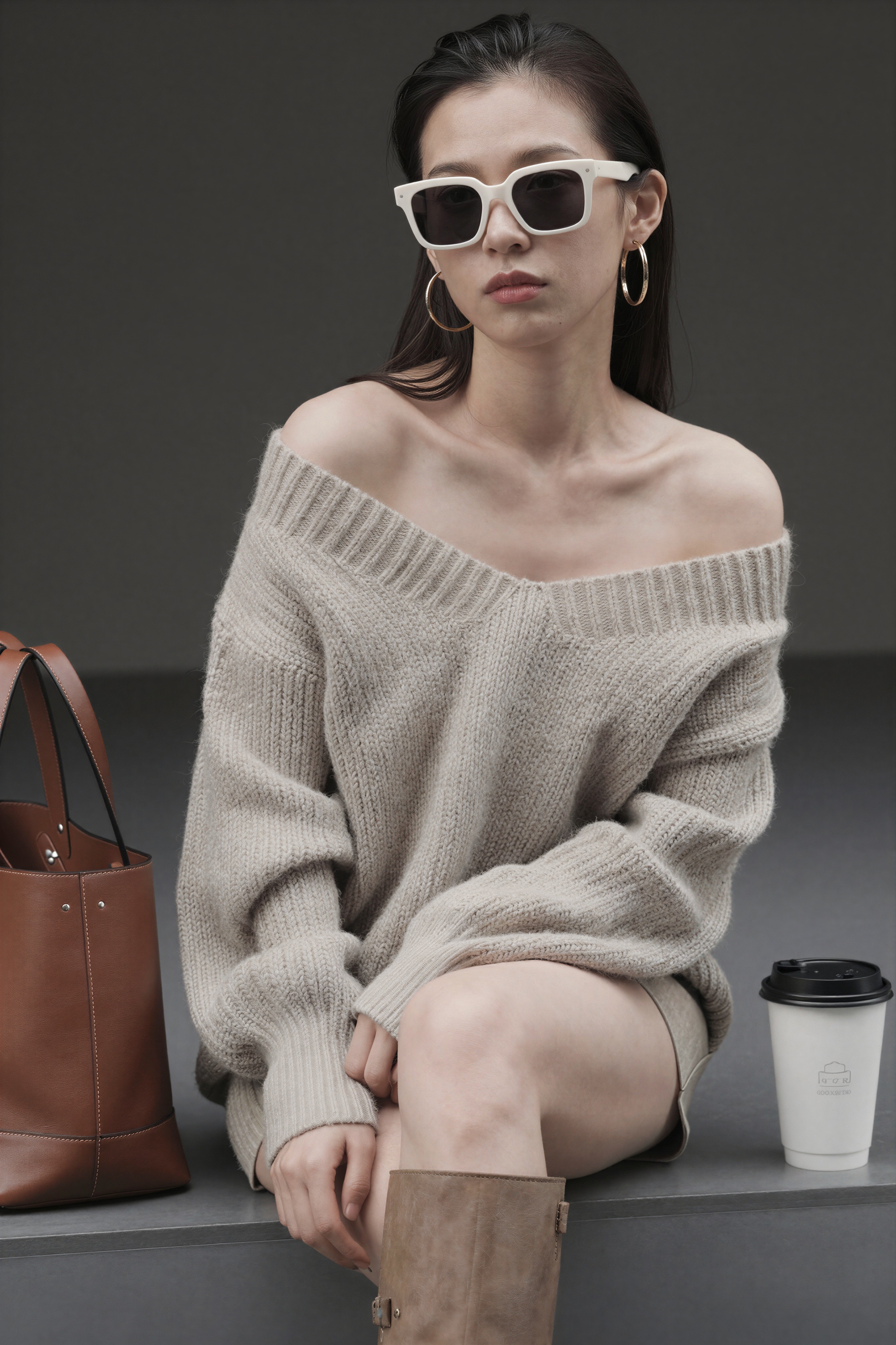 若い頃の彼女は、特大の白いフレームのサングラス、大きなゴールドのフープ イヤリング、そしてフレームにゆったりとかかるオートミール ベージュの分厚いニットのオフショルダー セーターを着ています。彼女の衣装は、マッチする背の高いスエード ブーツで完成されています。茶色の革のトートバッグが彼女の横の棚の上に置かれ、その隣に黒い蓋の付いた使い捨てのコーヒーカップが置かれています。彼女の後ろに。高画質でフリーのNightStock素材です。商用利用可能・クレジット表記不要。