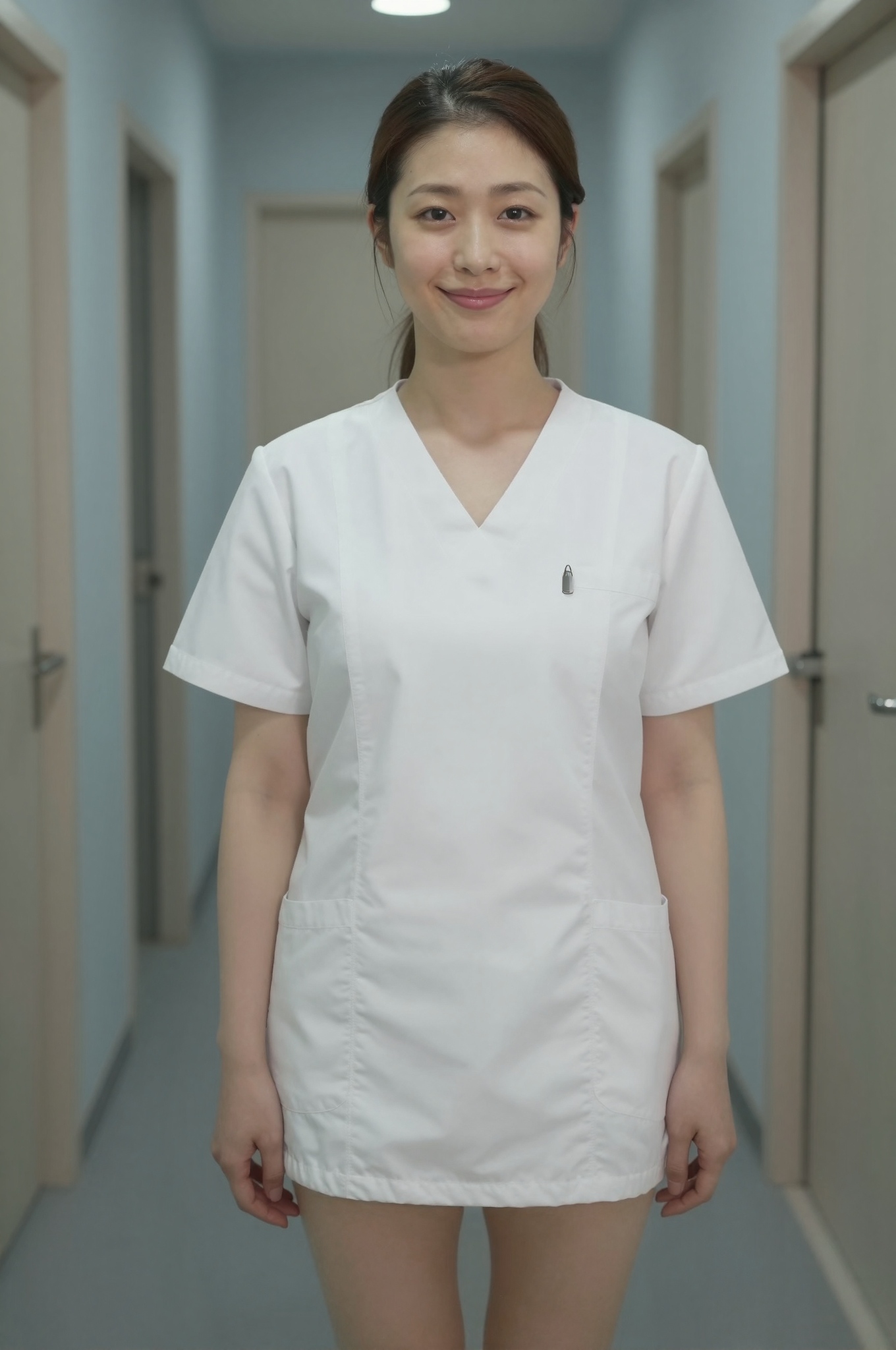 施術室のドアに番号が付けられているサロンの廊下に自信に満ちたスタッフが立っており、全体が覆われた柔らかな白のシンプルで清潔なスクラブを着ており、プライバシーのために顔はわずかにぼやけており、水色で清潔なモダンな壁があり、パートタイムのカジュアルな雰囲気があり、居心地が良く歓迎的であり、テキスト、文字、数字、書き込み、透かしは一切ありません。。高画質でフリーのNightStock素材です。商用利用可能・クレジット表記不要。