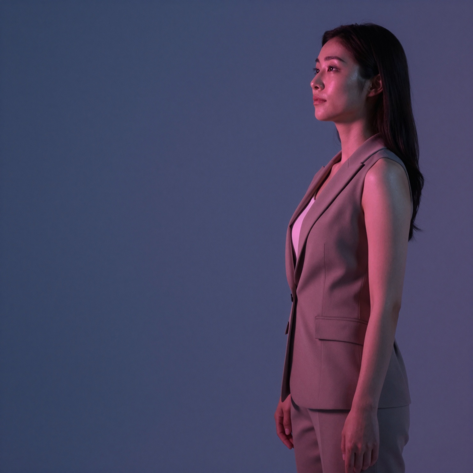 ビジネスライクでありながらフェミニンなアンサンブルを着た美しい日本人女性。右端の横顔のシルエット。きれいな深い青から暗いグラデーションの背景がフレームの 70% をカバーし、テキストにシャープでプロフェッショナルなスペースを提供します。雰囲気は深刻ですが、魅力的です。テキスト、文字、数字、書き込み、透かしは一切ありません。高画質でフリーのNightStock素材です。商用利用可能・クレジット表記不要。