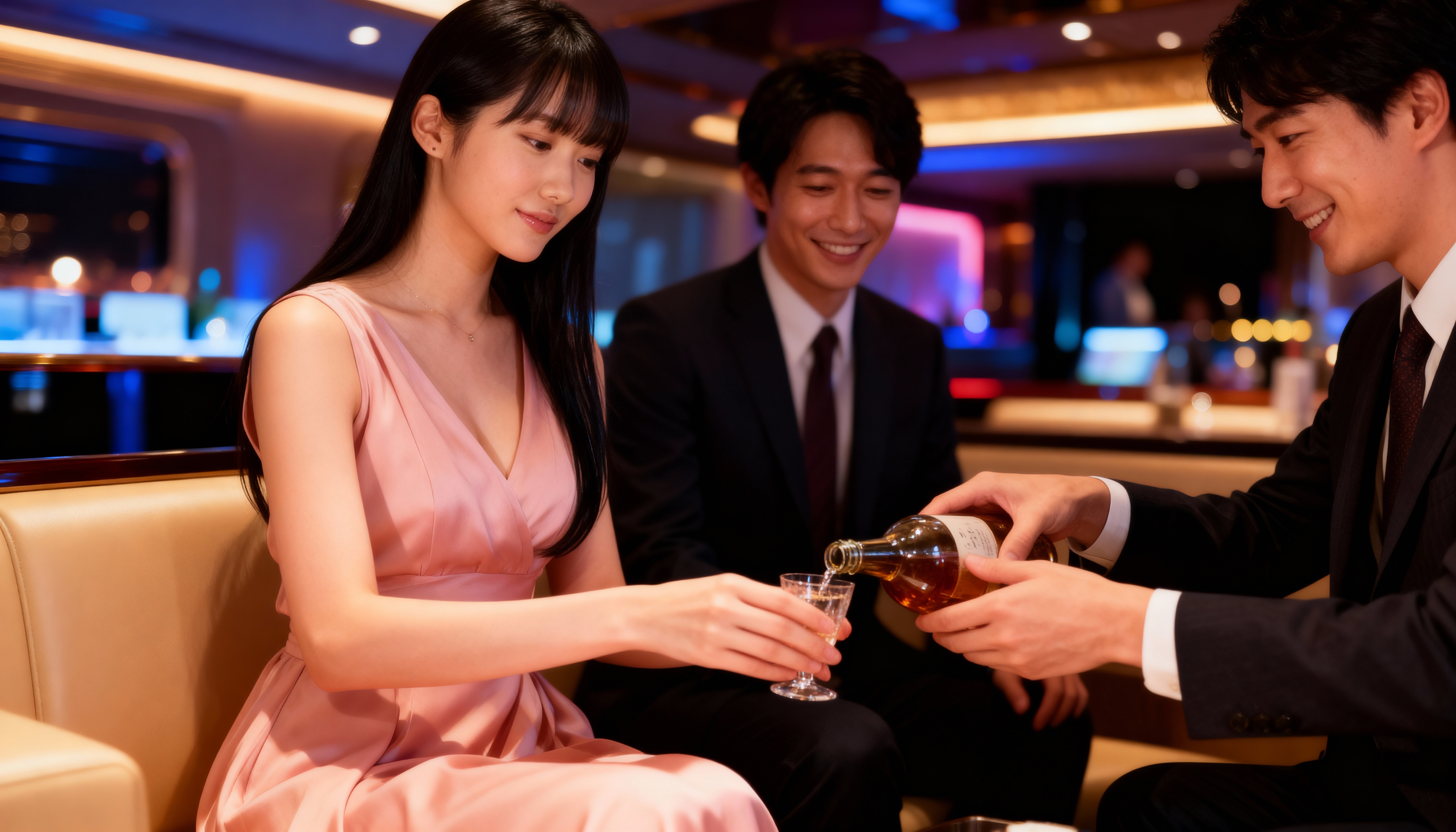 ピンクのドレスを着た若い女性が豪華なバーのテーブルに座り、ボトルからグラスに飲み物を注いでいる横のカメラアングルからの写実的なシーン。その近くにはスーツを着た二人の男性が座り、微笑みながら会話をしている。画像の左側の女性は、ピンクのノースリーブのドレスを着た、長い黒髪の若いアジア人女性のように見え、シーンの中央にあるベージュの革製のソファに座っています。彼女は左手に小さなグラスを持ち、微笑みながらボトルを見下ろしている。右側の男性は、同じく右手にグラスを持ち、彼女の右手にコニャックのボトルを注いでいる。背景には、青と紫のライトが照らされた薄暗いバーが表示され、暖かく魅力的な雰囲気を作り出しています。舞台となるのは、リムジンかヨットと思われる高級車のエレガントで豪華なインテリアで、洗練された雰囲気を醸し出しています。