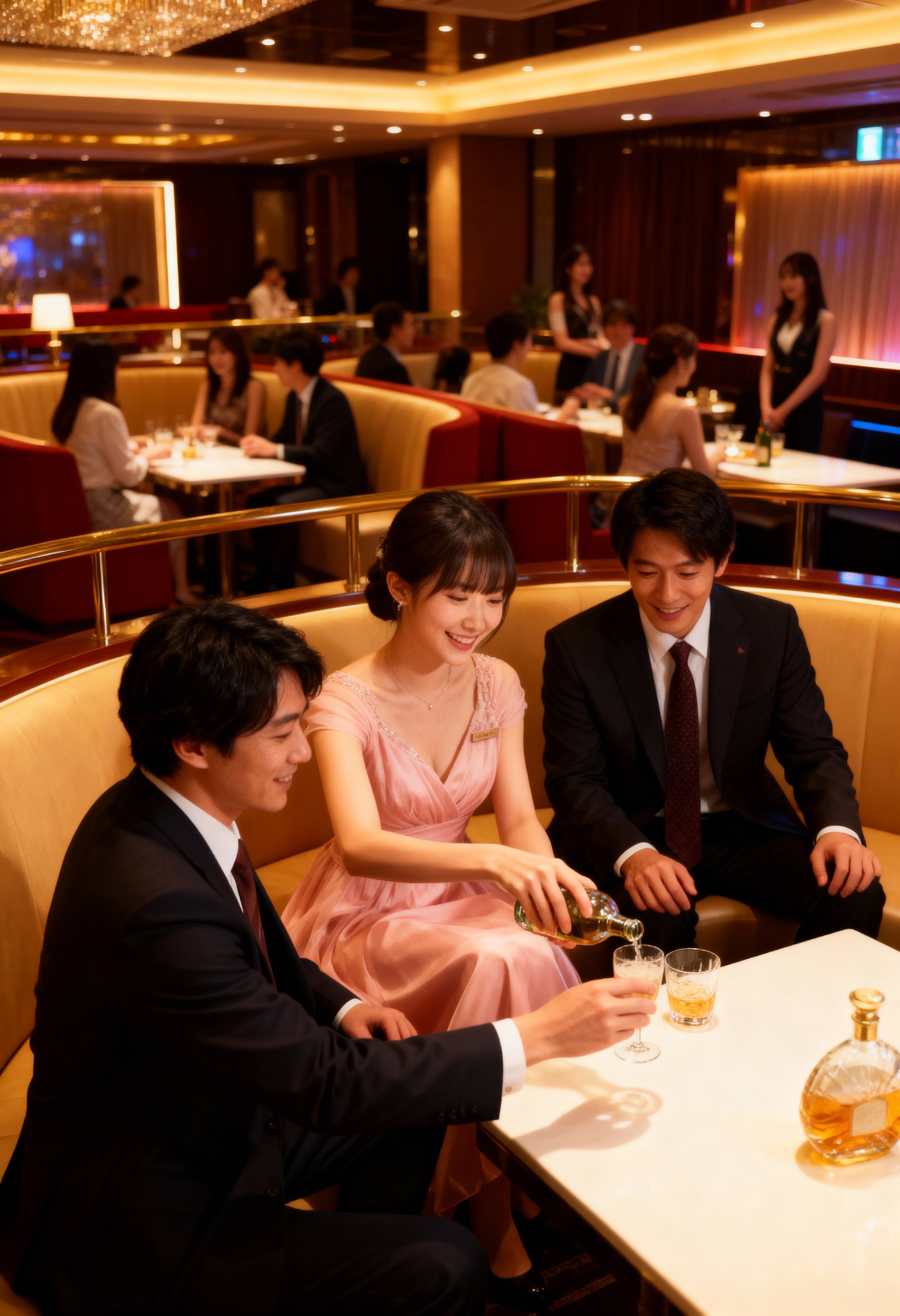 高級レストランで3人でお酒を楽しむロマンチックなシーンを正面からフォトリアルに撮影。画像の左側では、ピンクのドレスを着た若い女性がブースに座り、微笑みながらボトルからグラスに飲み物を注いでいます。一方、スーツを着た二人の男性が彼女の両側に座って、やはり笑顔で飲み物を楽しんでいます。女性はエレガントなアップヘアにまとめられた短い黒髪をしているが、男性はフォーマルな服装をしており、1人は黒いスーツを着ており、もう1人は赤いネクタイをしている。背景には、赤いベルベットのブースとテーブルを備えた薄暗いレストランが示されており、天井からはシャンデリアが吊り下げられており、暖かく魅力的な雰囲気を作り出しています。照明は柔らかく温かみがあり、レストランの豪華な雰囲気を強調しています。