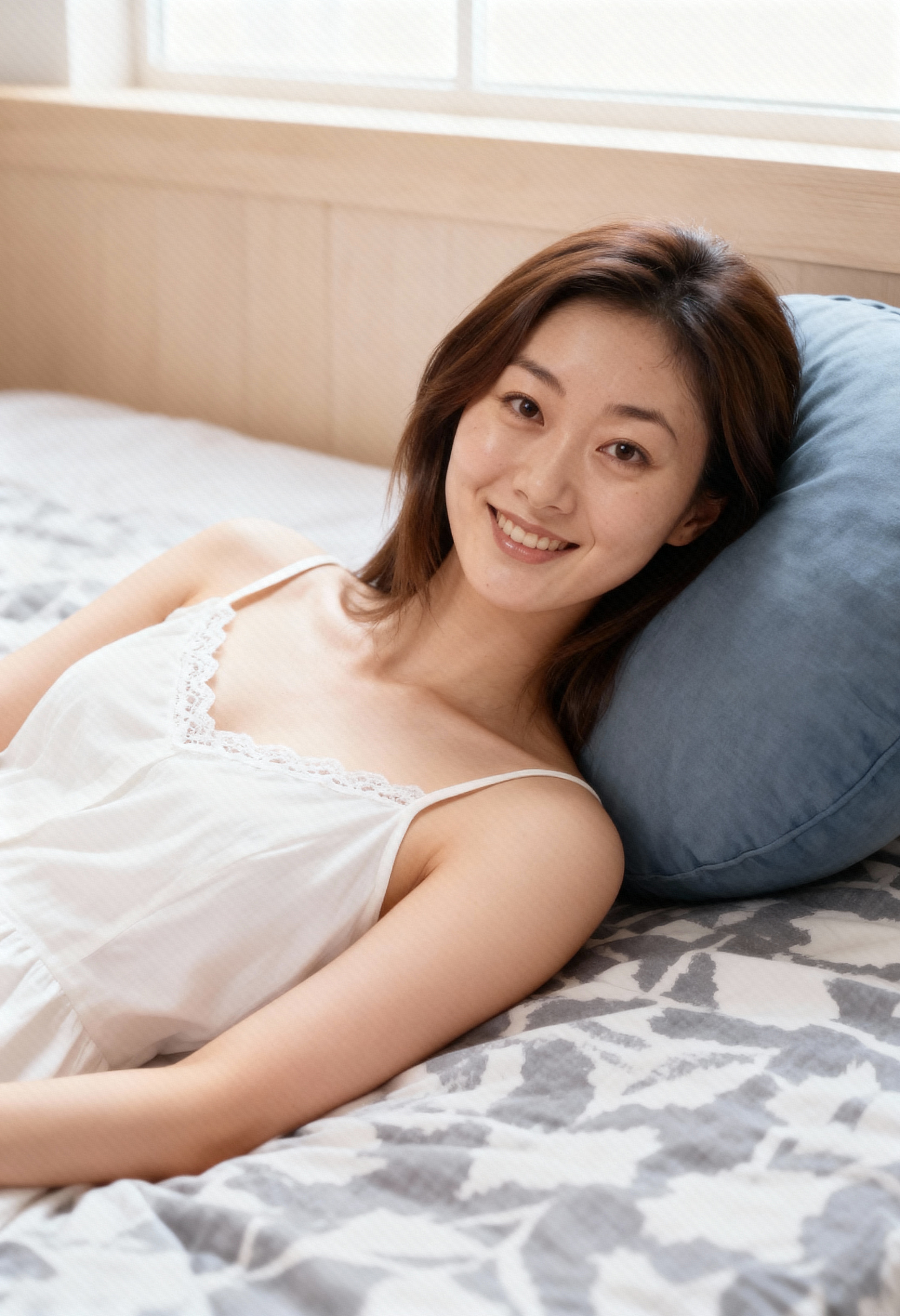 ベッドに横たわり、カメラに向かって微笑む若い女性の写実的なポートレート。その女性は10代後半か20代前半に見え、長い茶色の髪と茶色の目で、視聴者をまっすぐに見つめています。彼女はレースのトリムが付いた白いナイトガウンを着て、青い枕に頭を乗せて横向きに寝ています。背景は窓のある明るい色の寝室で、自然光が部屋に入り、柔らかく居心地の良い雰囲気を作り出しています。ベッドにはグレーと白の模様のブランケットがあり、全体的な雰囲気がリラックスして快適です。照明は柔らかく自然で、女性の特徴を強調し、暖かく魅力的な雰囲気を作り出しています。