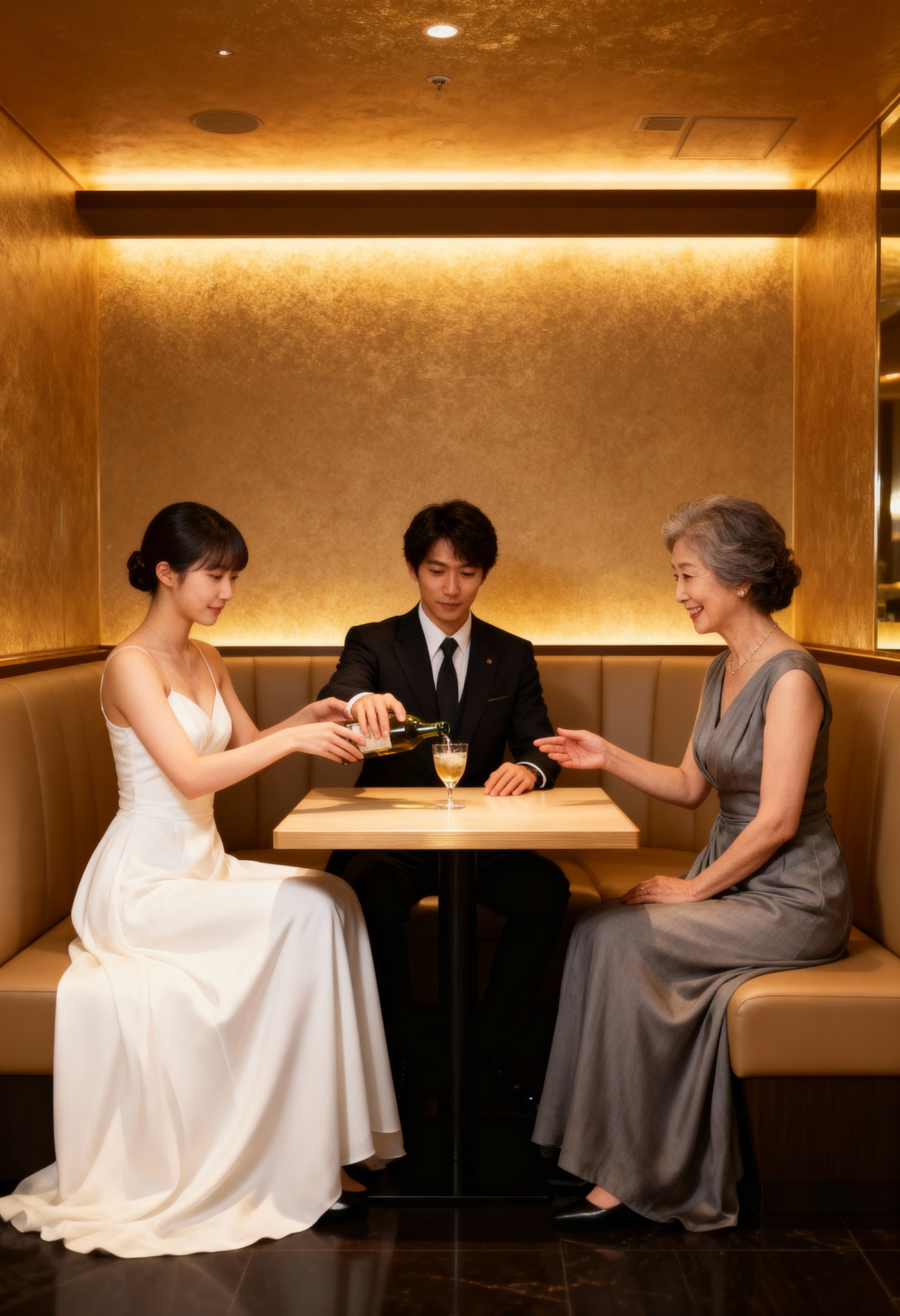 豪華なレストランでのアジア人女性 2 人と男性 1 人のロマンチックな瞬間を正面から写実的に撮影したものです。画像には、ブースの中央のテーブルに座っている新郎新婦も写っており、花嫁は白いウェディングドレスを着ており、新郎は黒いスーツに白いシャツと黒いネクタイを着ています。画像の左側では、黒髪の若い女性がテーブルに座り、白ワインの入ったグラスを持ち、花嫁の手にそれを注いでいます。彼女は笑顔で花嫁を見つめているように見えますが、右側には白髪の年配の女性がリラックスした表情で座っており、グレーのドレスを着て手をかざして花嫁と握手をしています。背景には、金の壁と柔らかな照明を備えた豪華なインテリアが示されており、暖かく魅力的な雰囲気を作り出しています。