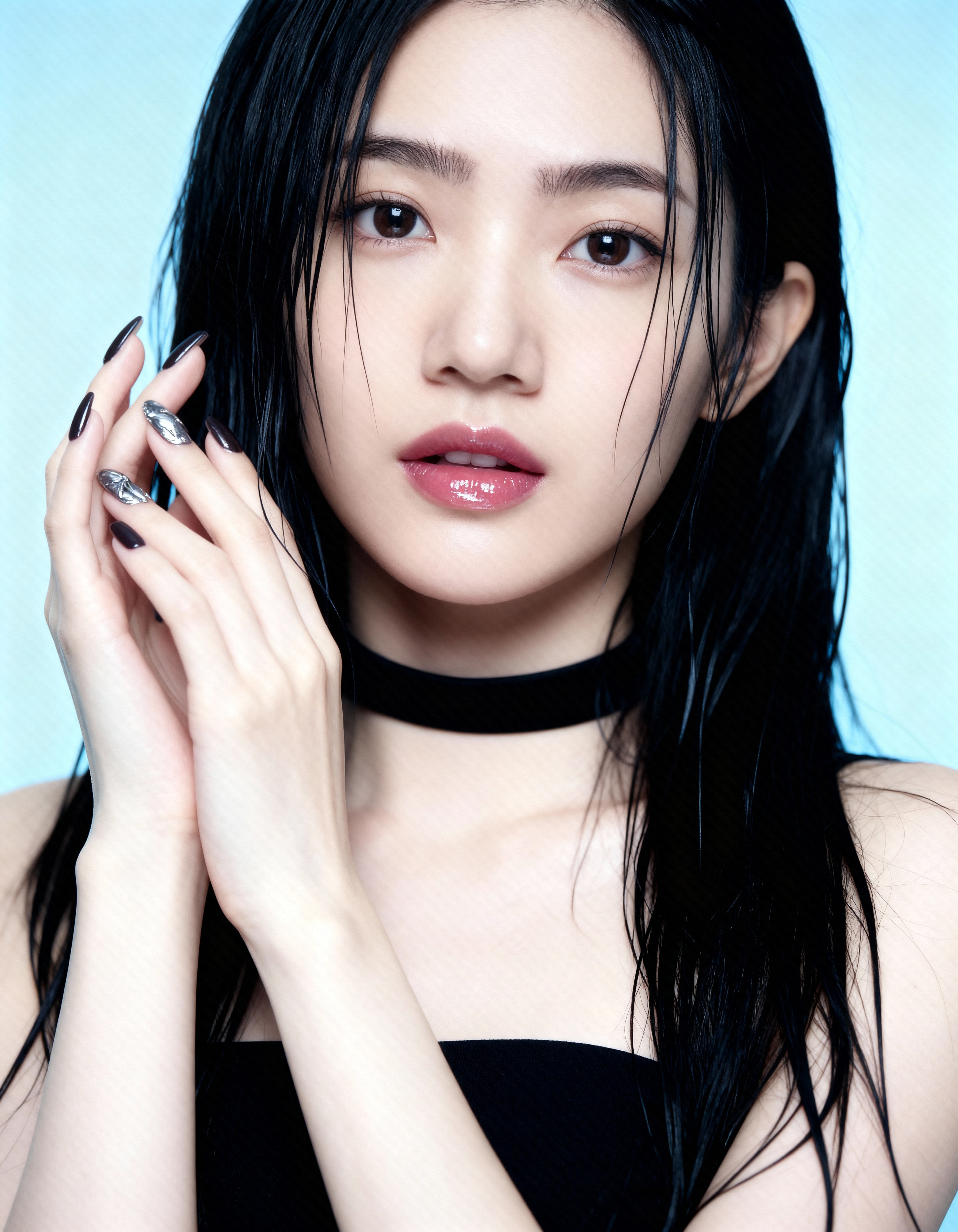 明るい青の背景にポーズをとる、長くまっすぐな黒髪と中性的な表情を持つ若い女性の写実的なポートレート。彼女は黒いチョーカーと黒いストラップレスのトップを着ており、顔の前で手を組んでいます。女性は10代後半か20代前半に見え、肌は白く、大きな茶色の目をしていた。彼女の髪はゆるやかなウェーブに整えられ、背中に流れ落ち、顔を完璧に縁取っています。彼女の唇は光沢のあるピンクの口紅で塗られており、最小限の労力で繊細でナチュラルなメイクアップをしています。彼女の爪はダークなメタリックポリッシュで塗装されており、彼女の全体的な外観に洗練されたタッチを加えています。照明は柔らかく自然で、彼女の特徴を強調し、穏やかな雰囲気を作り出しています。イメージ全体の雰囲気はエレガントで洗練されており、女性の美しさと優雅さに焦点を当てています。