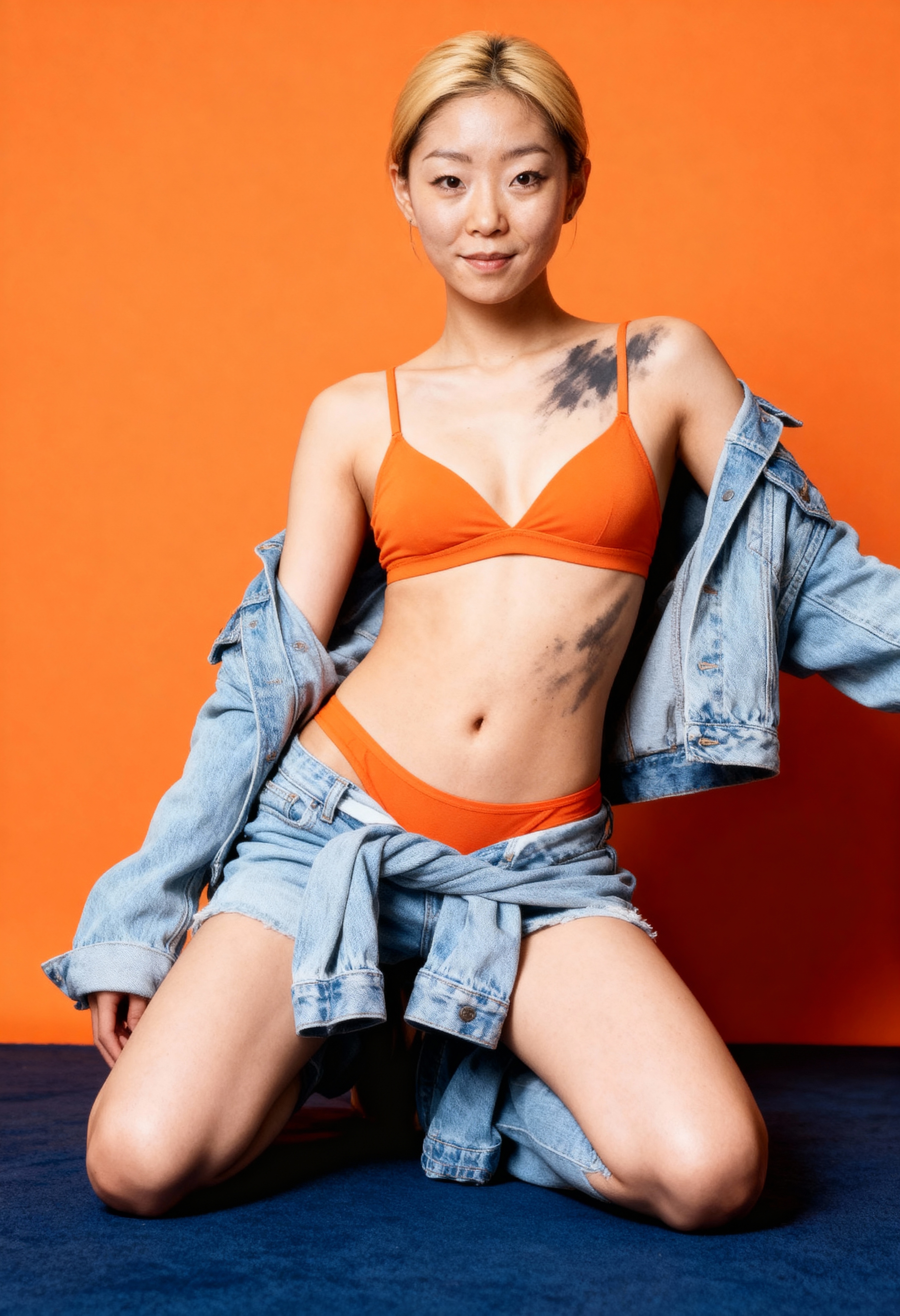 オレンジ色の背景に自信を持ってポーズをとる若い女性を、正面カメラのアングルから写実的に撮影したもの。画像の中央には、オレンジ色のブラジャーとデニムのショートパンツを着て、デニムジャケットを肩にかけて床に座っている女性も写っている。女性は10代後半か20代前半のように見え、肌は白く、顔にはかすかに笑みを浮かべている。彼女は中立的な表情でカメラをまっすぐに見つめています。彼女のブロンドの髪はきちんとしたストレートな外観にスタイリングされており、目は明るい茶色です。彼女の体はスリムで、左肩にタトゥーがあります。背景はオレンジ一色で、画像はミニマルで芸術的な雰囲気を持っています。照明は明るく均一で、女性の曲線と衣服の質感を強調しています。