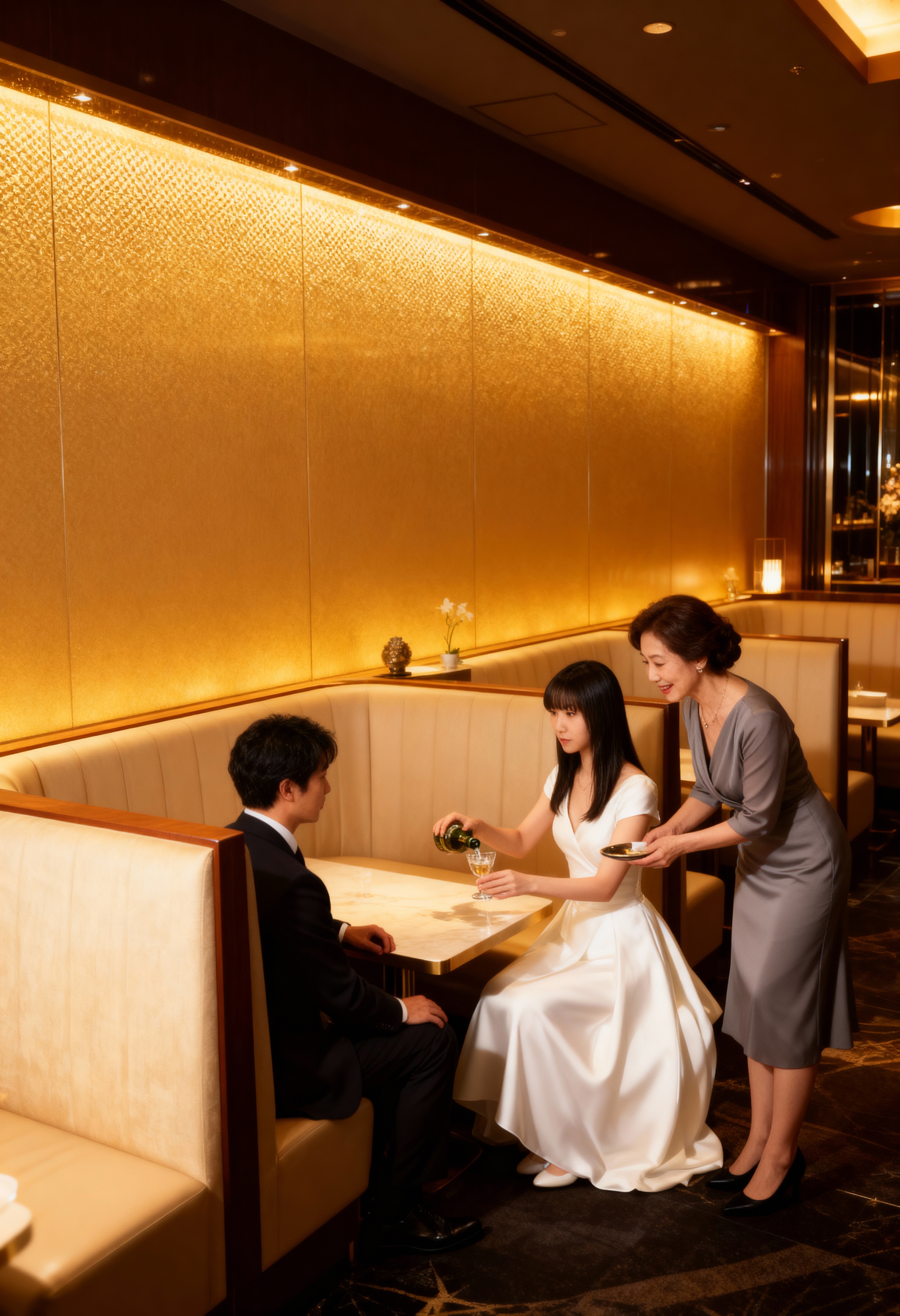 レストランのロマンチックな雰囲気を表現する、ローアングルからの写実的な撮影。この画像には、女性 2 名と男性 1 名の 3 人が画像の中央のテーブルに座っているのが写っています。左側の女性は、ネックラインが大きく開いた半袖の白いウェディングドレスを着ており、手にはシャンパンのグラスを持っています。彼女は黒いスーツとネクタイを着てテーブルに座っている男性の前で床にひざまずいています。右側では、灰色のドレスを着た女性が男性に皿を持って給仕しており、彼女はその隣に立って小さな皿を持っています。部屋は薄暗く、温かみのある金色の照明で居心地の良い雰囲気を作り出しています。壁は質感のある金色の壁紙で覆われており、テーブルには白い花が咲いた小さな花瓶があります。全体的な雰囲気はエレガントでロマンチックで、3人の間の親密な瞬間に焦点が当てられています。