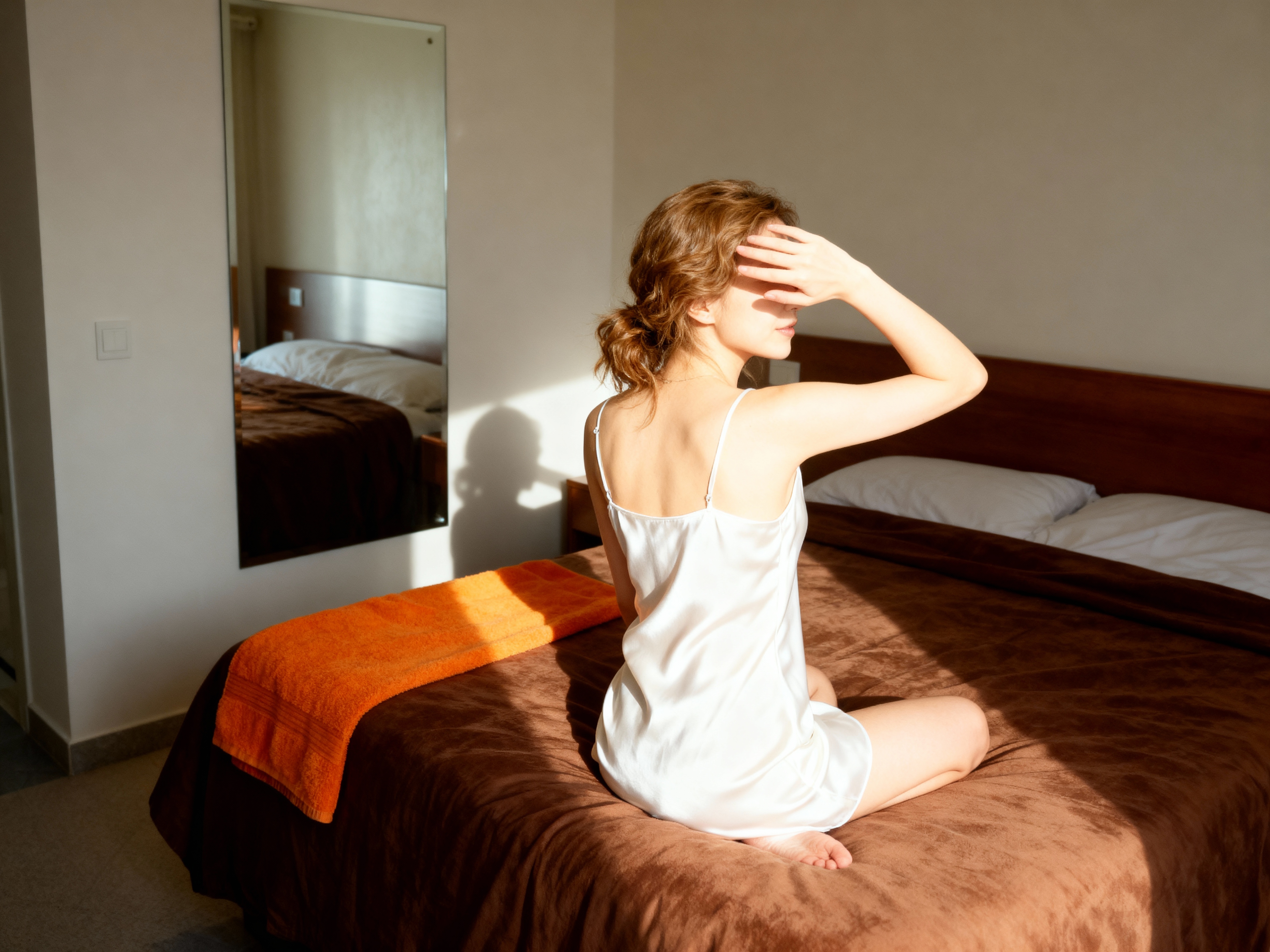 ミニマルな装飾と壁に大きな鏡のあるモダンな寝室で、白いナイトガウンを着てベッドに座って手で目を覆っている若い女性を横から写実的に撮影したもの。この画像には、ベッドの上に茶色のベッドカバーとオレンジ色のタオルも示されています。画像の中央では、白い肌とウェーブのかかった茶色の長い髪を持つ 20 歳の女性が、カメラに背を向けて座っており、見る人から背を向け、上半身が見えています。彼女は細いストラップと裸の肩が付いたシンプルな白いスリップドレスを着ており、その表情は穏やかで瞑想的です。部屋は木製のヘッドボードと白い壁を備えたミニマルなデザインで、鏡からの自然光で明るく、彼女の顔と体に暖かい輝きを放っています。