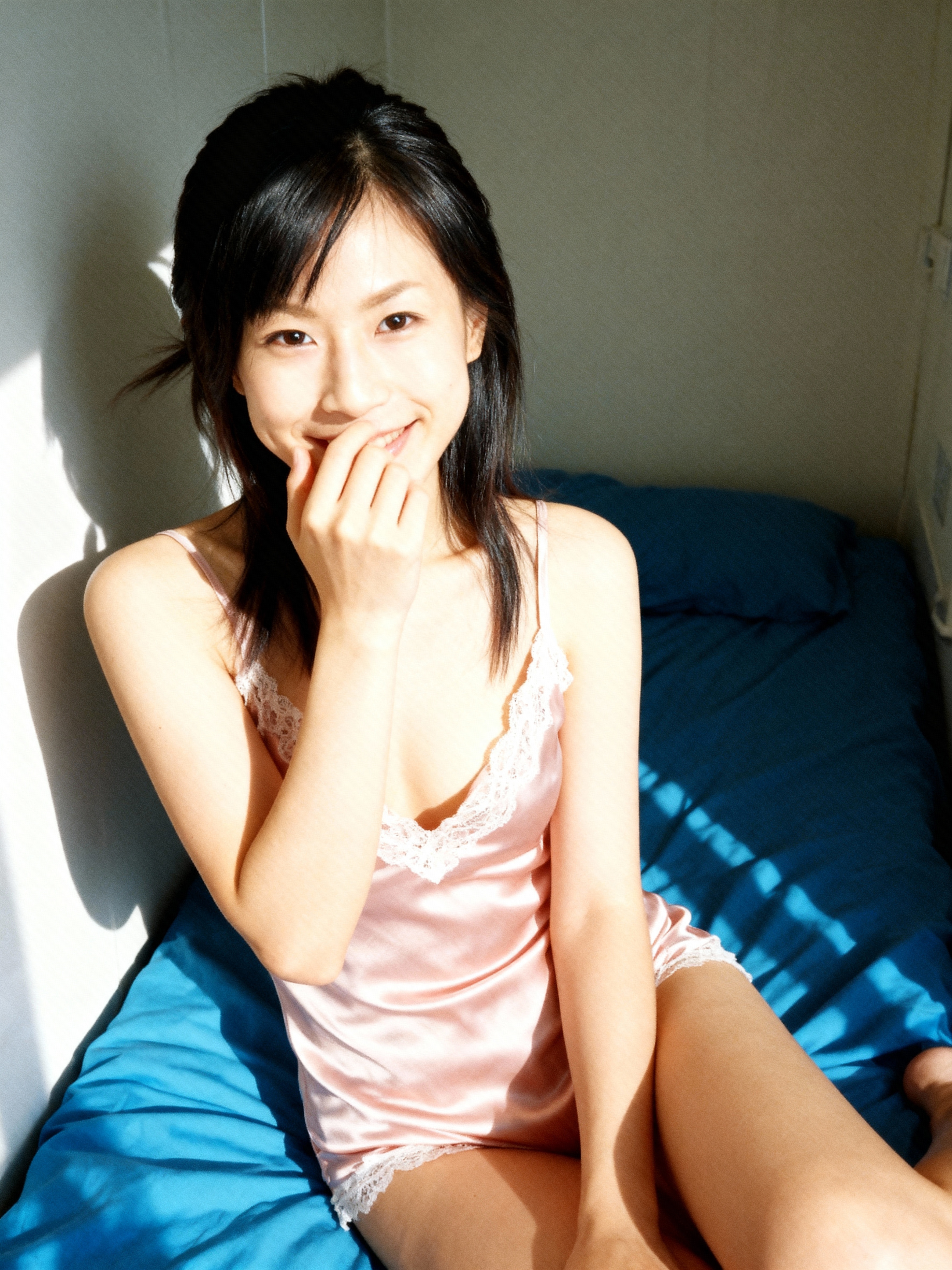 レースのトリムが付いたピンクのサテンのナイトガウンを着て、居心地の良い寝室のベッドに座っている若い女性を、正面カメラのアングルから写実的に撮影したものです。画像には、画像の中央に座っている若いアジア人女性も写っており、上半身は視聴者の方を向いており、笑顔でカメラを直接見つめています。彼女は、きちんと整えられた長い黒髪を持ち、茶色の瞳がまっすぐに見る者を見つめています。彼女はあごに手を置いて、まるで何かを深く考えているか考えているかのように見えます。女性は、繊細なレースのトリムが付いたライトピンクのシルクキャミソールを着ており、全体的な外観にエレガントなタッチを加えています。背景は青いベッドカバーと白い壁のあるシンプルな寝室で、ベッドの左側に柔らかい影を落としています。照明は明るく自然で、暖かく居心地の良い雰囲気を作り出しています。全体的な効果は静けさと親密さの1つです。