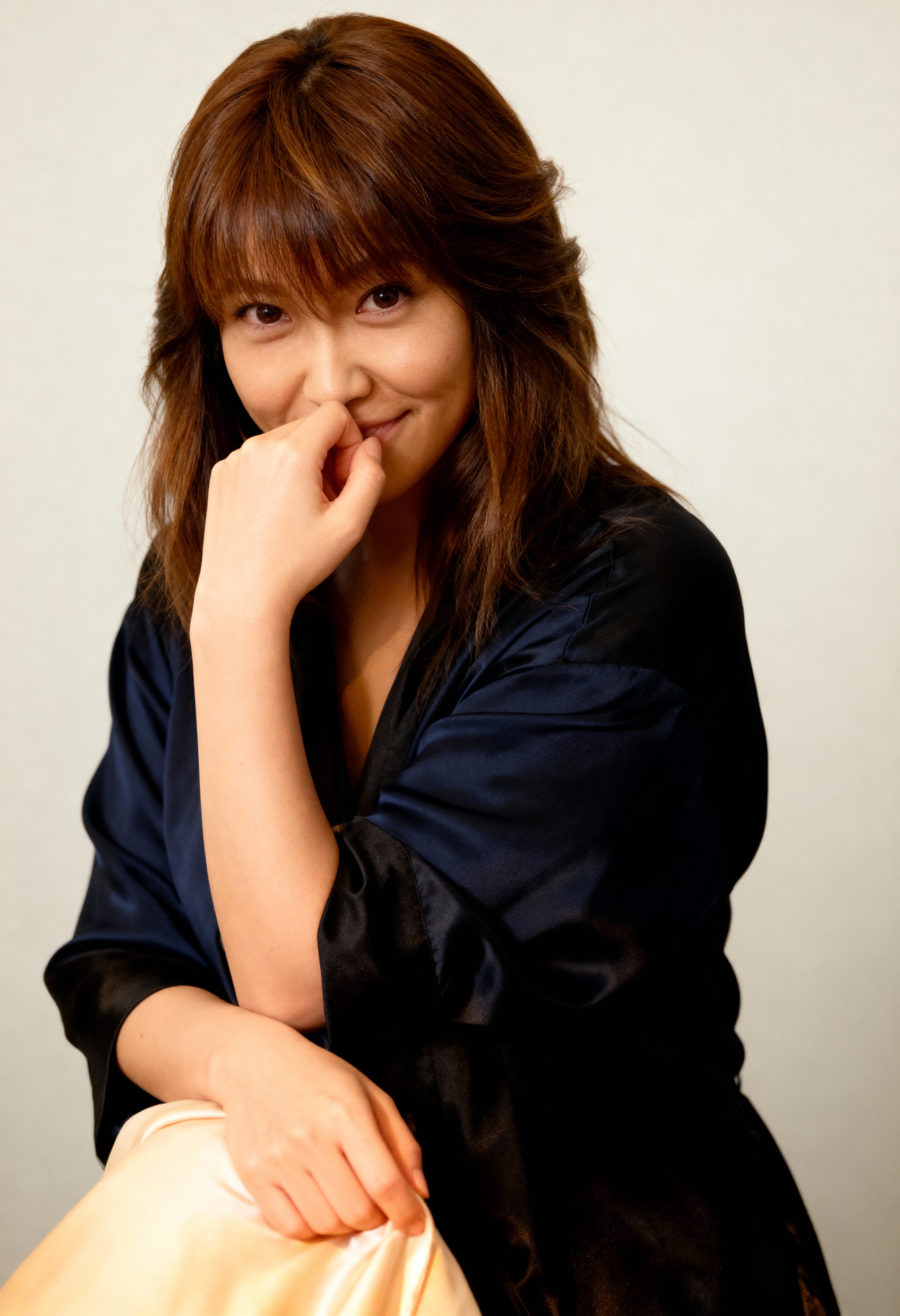 長い茶色の髪と思慮深い表情を持ち、あごを手に乗せてポーズをとっている若い女性を、ポートレート カメラ アングルから撮影した写実的なポートレート。この画像には、無地のライトグレーの背景と柔らかな照明も示されています。画像の中央には、10代後半か20代前半と思われる若いアジア人女性が、顔にわずかな笑みを浮かべ、茶色の瞳がカメラをまっすぐに見つめている。彼女は前髪のある茶色のストレートの長い髪を持ち、黒のアクセントが付いたネイビーブルーのローブを着ています。彼女の上半身が見えており、顔の前に白い布を持っています。照明は柔らかく温かみがあり、彼女の肌に優しい輝きをもたらします。