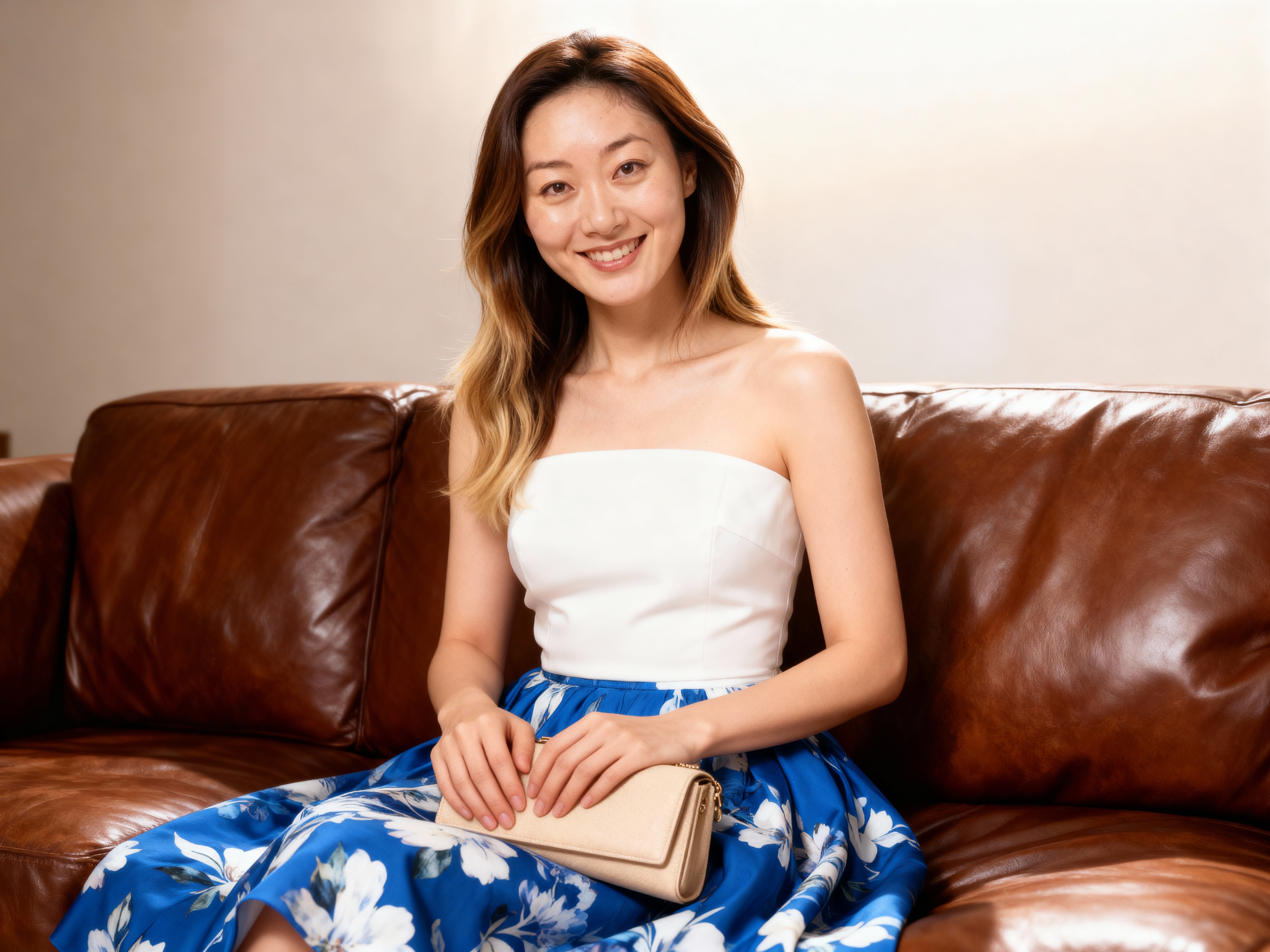 白いストラップレスのトップと青い花柄のスカートを着て、リビング ルームの茶色の革張りのソファに座っている若い女性の写実的なポートレート。その女性は10代後半か20代前半と思われ、ウェーブのかかった茶色の長い髪を持ち、わずかな笑みを浮かべてカメラを直接見つめている。彼女は画像の中央に座っており、上半身が見えており、両手は彼女の前で組まれています。彼女の髪はゆるやかなウェーブに整えられ、背中に流れて顔を縁取ります。彼女の目は明るい茶色で、ベージュのクラッチバッグなどの最小限のアクセサリーを身につけています。背景はシンプルな中間色の壁で、女性の服装に微妙なコントラストを与えています。照明は柔らかく自然で、暖かく居心地の良い雰囲気を作り出しています。
