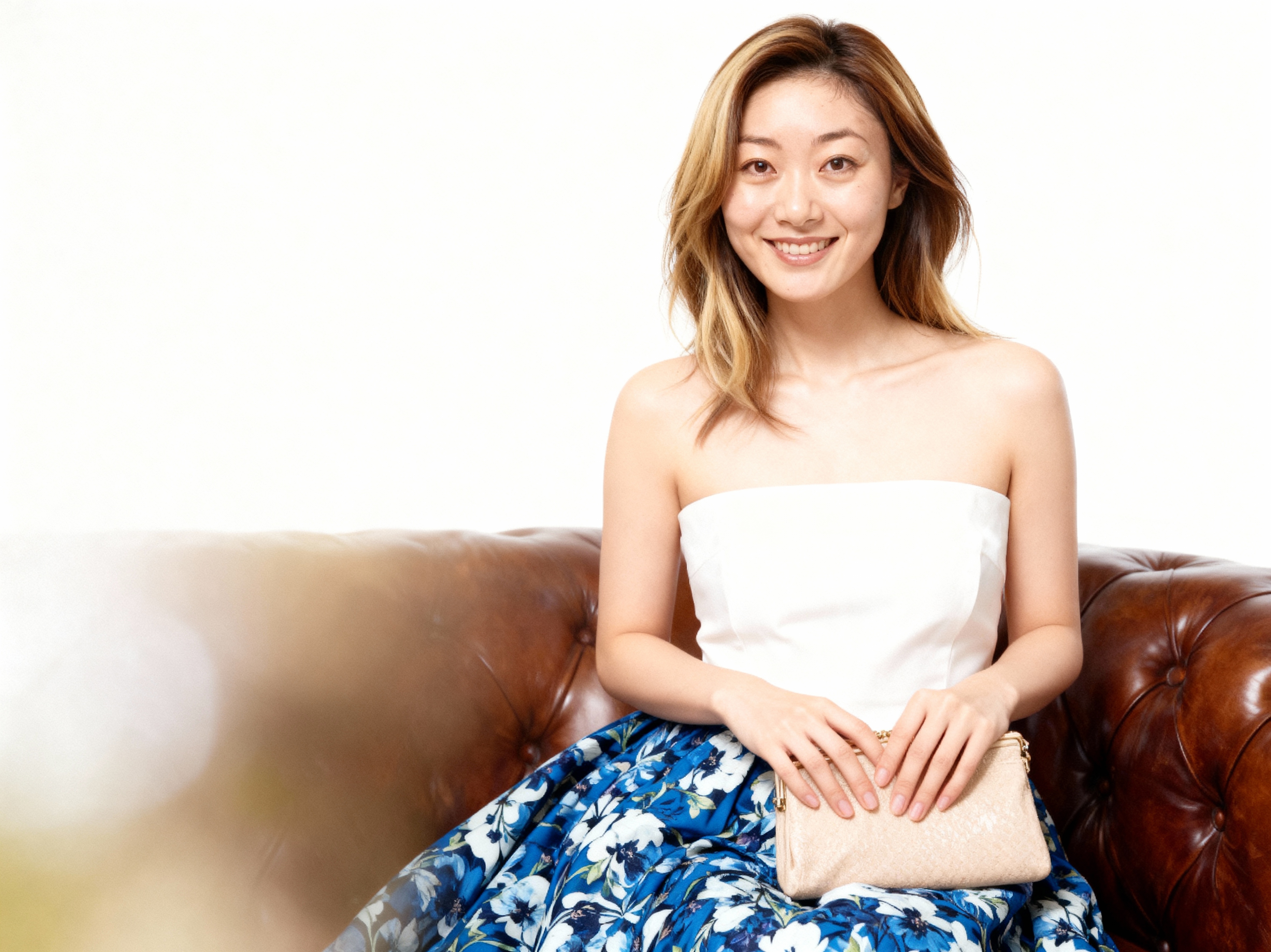 白いストラップレスのトップスと青い花柄のスカートを着て、リラックスしたポーズで茶色の革張りのソファに座っている若い女性。 10代後半か20代前半と思われる女性は、ブロンドのハイライトが付いた明るい茶色のストレートなロングヘアーと茶色の目で、フレンドリーな笑顔でカメラをまっすぐに見つめています。彼女は画像の中央に座っており、上半身を視聴者に向け、両手を前で組んでベージュのクラッチバッグを持っています。背景は無地の白い壁で、柔らかくぼやけたボケ効果があり、画像に夢のような幻想的な品質を与えています。