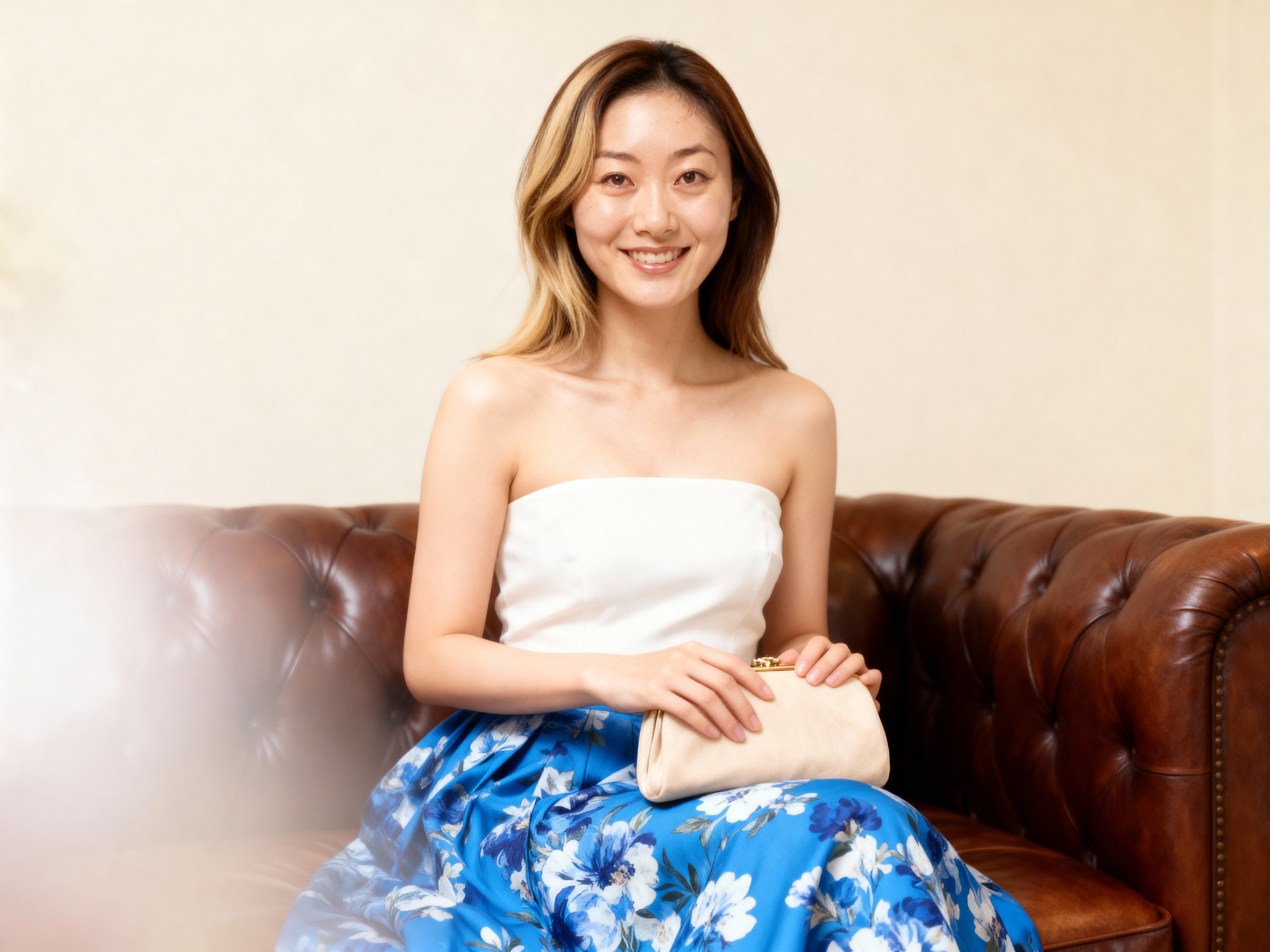 白いストラップレスのトップと青い花柄のスカートを着て、リラックスしたポーズで茶色の革張りのソファに座っている若い女性の写実的なポートレート。その女性は10代後半か20代前半と思われ、長くてストレートな明るい茶色の髪をしており、カメラに向かって微笑んでいる。彼女は画像の中央に座っており、上半身は視聴者の方を向いており、目は視聴者をまっすぐに見ています。彼女の表情は優しい笑顔で、手にはクリーム色の小さなクラッチバッグを持っています。背景は無地のベージュの壁で、ソファの左側から柔らかな自然光が差し込み、柔らかくぼやけた効果を生み出しています。全体的な雰囲気はリラックスしたカジュアルで、女性の陽気な表情と後ろの壁のニュートラルカラーパレットに焦点を当てています。