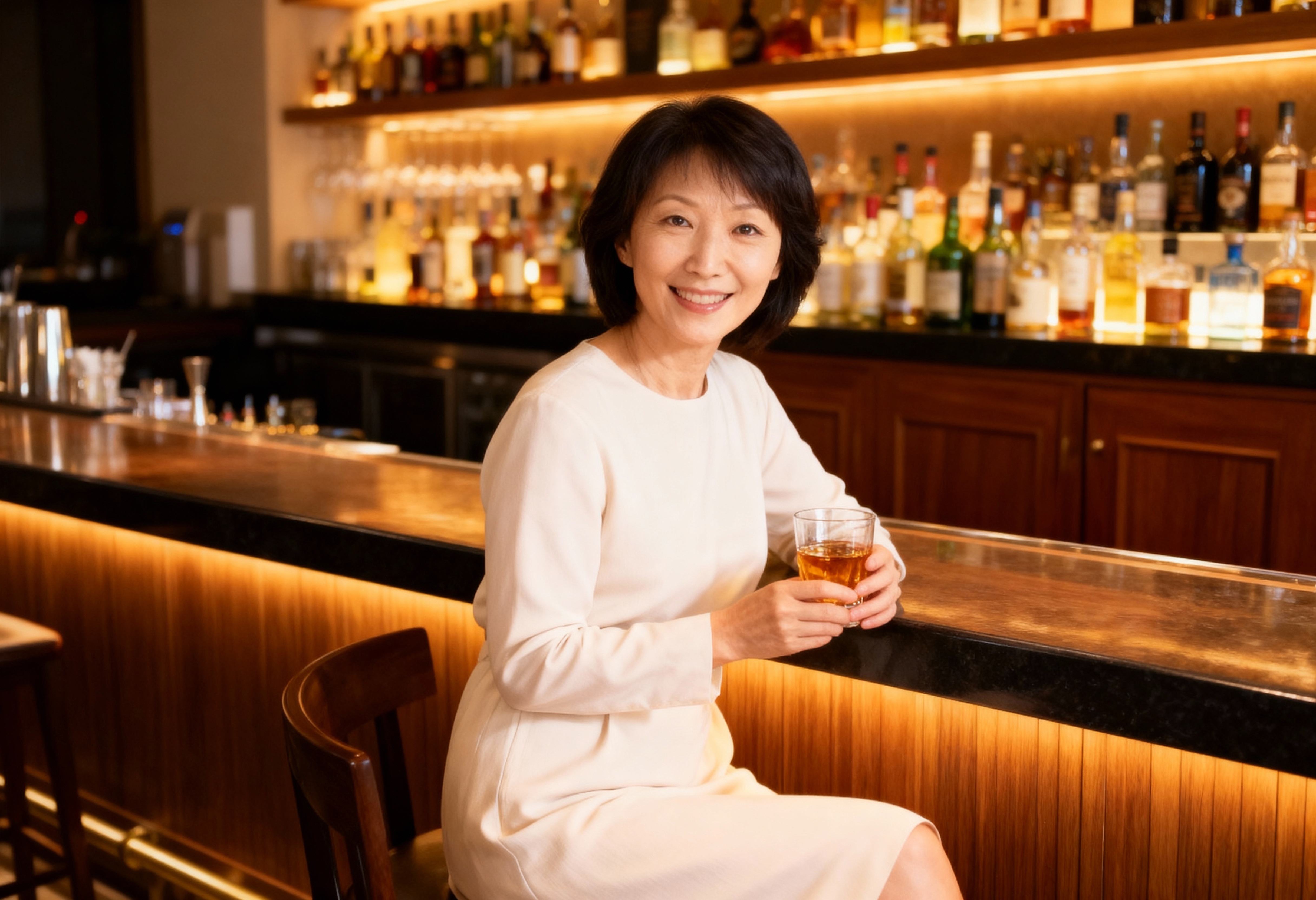 バーに座り、ウィスキーのグラスを持った中年のアジア人女性のポートレート。女性は短い黒髪で、長袖の白いドレスを着ています。彼女は笑顔でカメラを直接見ています。バーカウンターはダークウッドでできており、彼女の後ろの棚には酒瓶が並んでいます。照明は暖かく柔らかで、居心地の良い雰囲気を作り出しています。背景はぼやけていますが、焦点は女性とその飲み物にあります。彼女は60代後半か70代前半に見え、顔にはかすかに笑みを浮かべている。