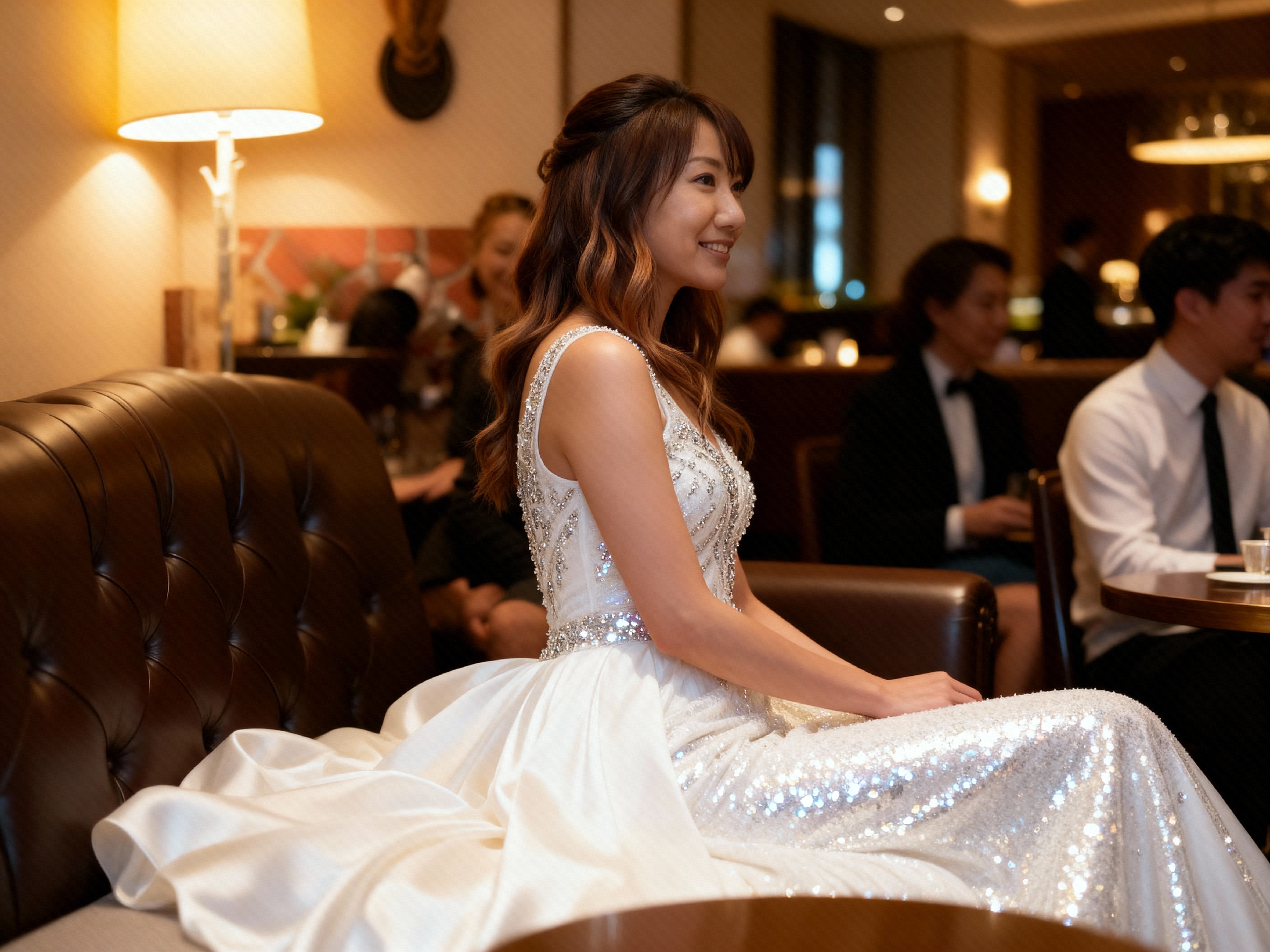画像中央の茶色の革張りのソファに座る花嫁は、大きく開いたネックラインが体型を際立たせる白いスパンコールのウェディングドレスを着ている。彼女の長い茶色の髪は背中に流れており、彼女は顔に穏やかな笑みを浮かべて横を向いています。部屋は薄暗く、温かみのある金色の照明で居心地の良い雰囲気を作り出しています。背景には、フォーマルな雰囲気でテーブルに座っているゲストが見え、柔らかくぼかした背景がシーンの親密な雰囲気を高めています。花嫁は20代半ばと思われ、色白でスラリとした体格で、ドレスにはキラキラと輝くスパンコールが光を受けてキラキラと輝き、エレガントで洗練された印象です。
