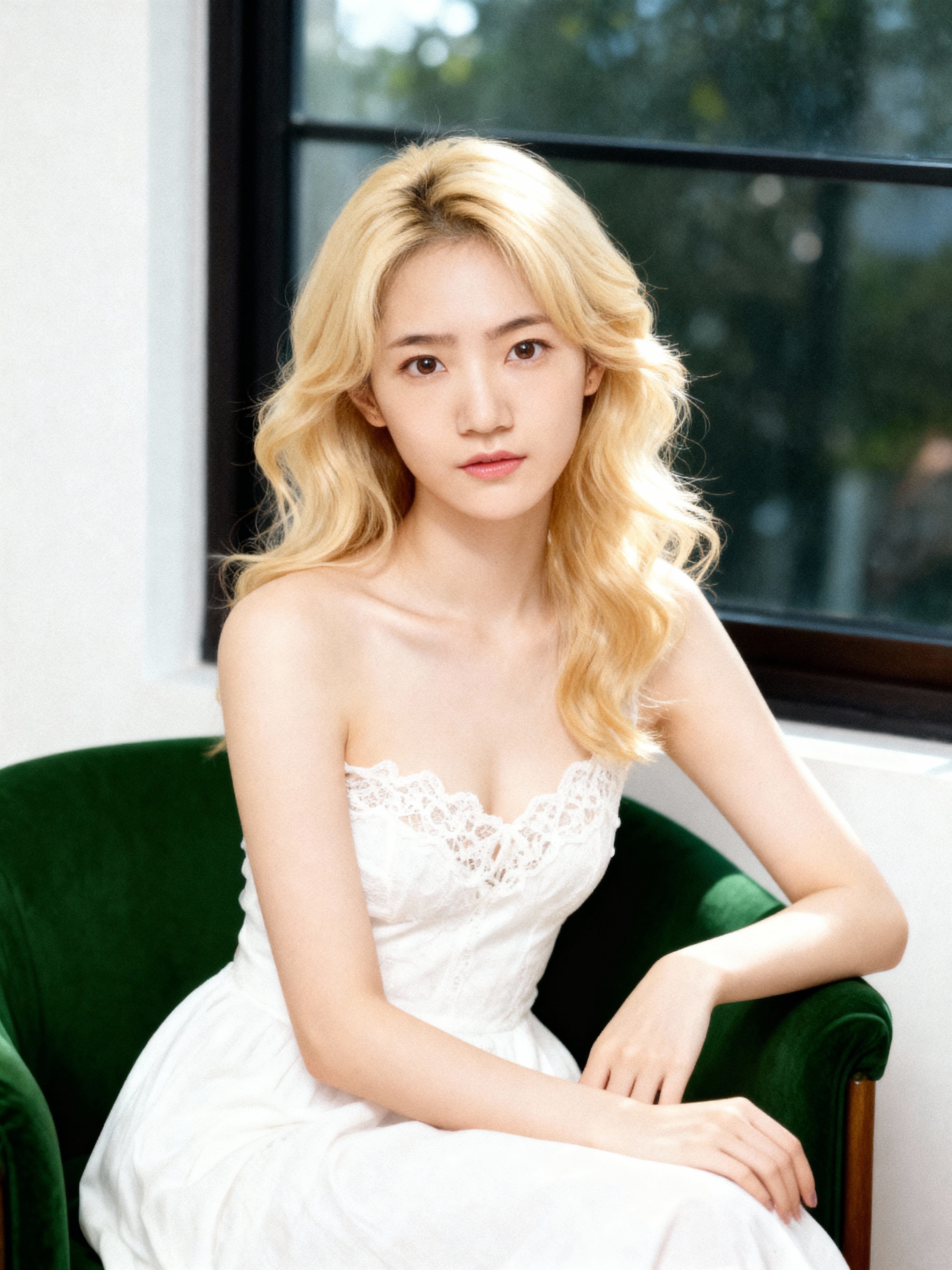 屋内で緑のベルベットの椅子に座る、長くウェーブのかかったブロンドの髪を持つ若い女性の写実的なポートレート。 10代後半から20代前半と思われる女性は画像の中央に位置し、上半身は視聴者に面し、中立的な表情で視聴者をまっすぐに見つめています。彼女はレースのトリムが付いた白いストラップレスのドレスを着ており、彼女のほっそりした体格と繊細な顔立ちを強調しています。彼女の髪はゆるやかなウェーブで背中に流れ、顔を縁取り、肩に流れ落ちています。彼女の目は濃い茶色で、口元にはわずかな笑みが浮かんでいます。彼女の両手は前で組まれ、椅子の肘掛けの上に置かれています。背景には大きな窓があり、外の緑がぼやけて見え、自然光が差し込み、柔らかく夢のような雰囲気を作り出しています。照明は柔らかく自然で、彼女の繊細な特徴を強調し、静けさを感じさせます。全体的な効果は静けさと静けさであり、女性の姿勢と表情が平和で親密な雰囲気を作り出しています。