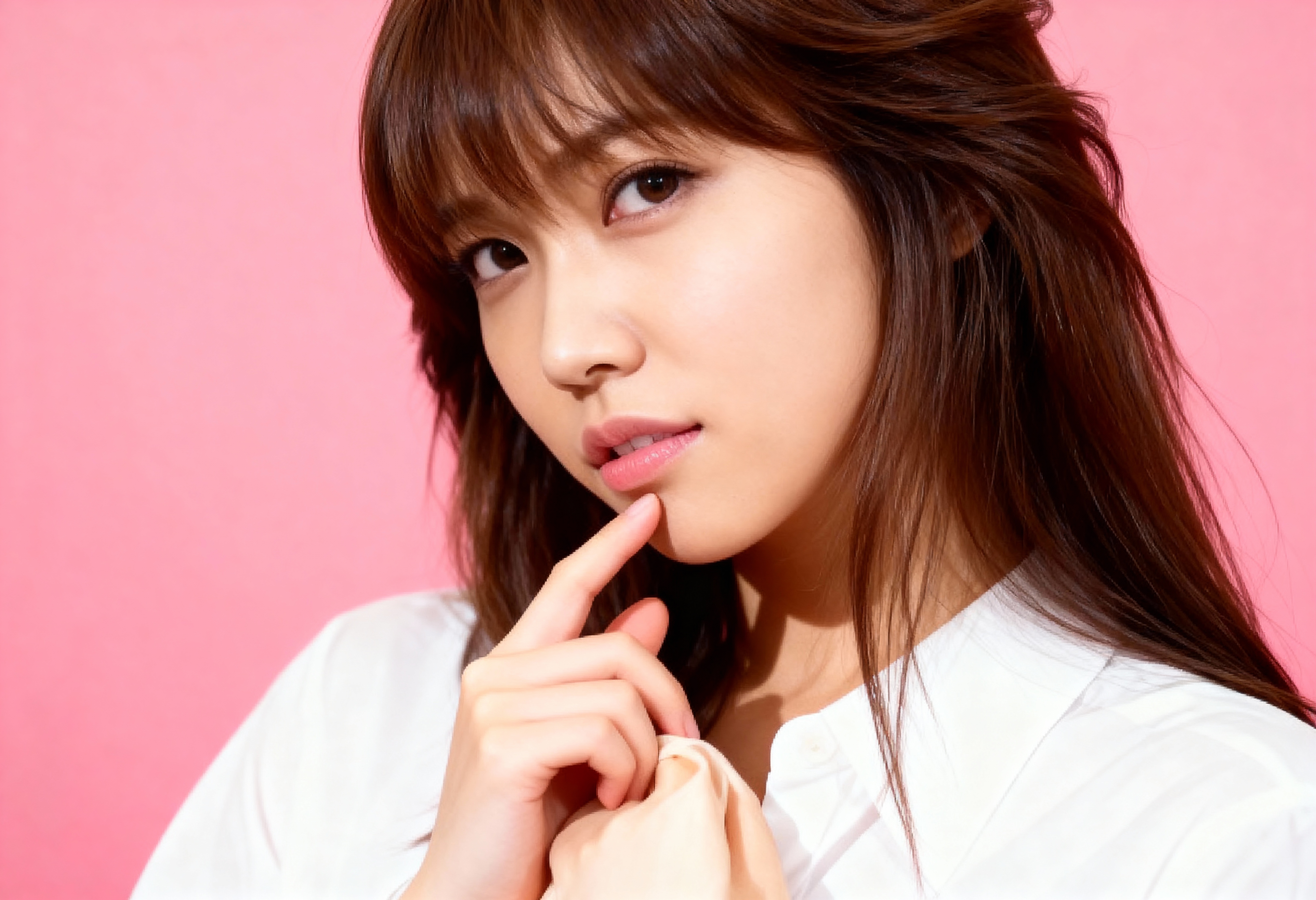 濃い茶色の真っ直ぐな髪と白い肌を持つ若いアジア人女性が、ピンク色の背景にポーズをとるクローズアップのポートレート。彼女は思慮深い表情でカメラを直接見つめており、あごに手を当てて深く考え込んでいるかのようです。女性は10代後半か20代前半に見え、スリムな体と口元にわずかな笑みを浮かべています。彼女は茶色の目をしており、白いボタンダウンシャツを鎖骨の中に押し込んで着ています。照明は柔らかく自然で、彼女の特徴を強調しており、全体的な雰囲気は穏やかで瞑想的です。