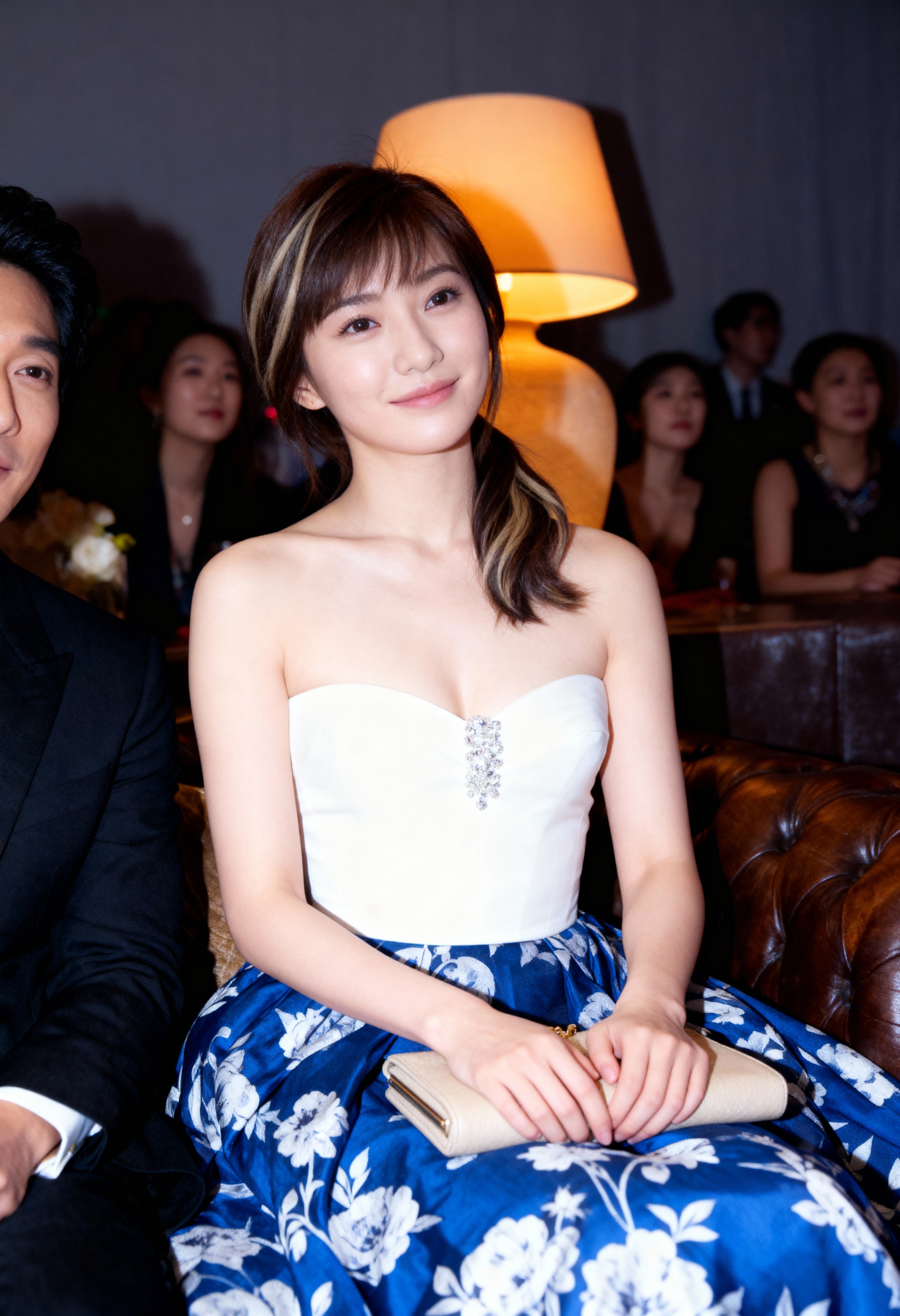 フォーマルなイベント会場で茶色の革張りのソファに座り、白いストラップレスのトップスと青い花柄のスカートを着て、前にベージュのクラッチを持った若い女性を正面カメラのアングルから写実的に撮影したもの。画像の中央には、長い茶色の髪と茶色の目をした若いアジア人女性が、顔に笑みを浮かべて座って、カメラを直接見つめています。彼女は10代後半か20代前半に見え、肌は白く、体格はスレンダーです。彼女の髪はゆるやかなウェーブに整えられ、背中に流れて顔を縁取ります。彼女は、恋人のネックラインと花柄のスカートを備えたストラップレスの白いトップスを着ており、手にはお揃いのクラッチを組み合わせています。背景には、オレンジ色の大きなランプが灯る薄暗い部屋と他のゲストが描かれており、洗練された雰囲気を醸し出しています。照明は柔らかく温かみがあり、彼女の特徴を強調し、優雅さと洗練の感覚を作り出しています。
