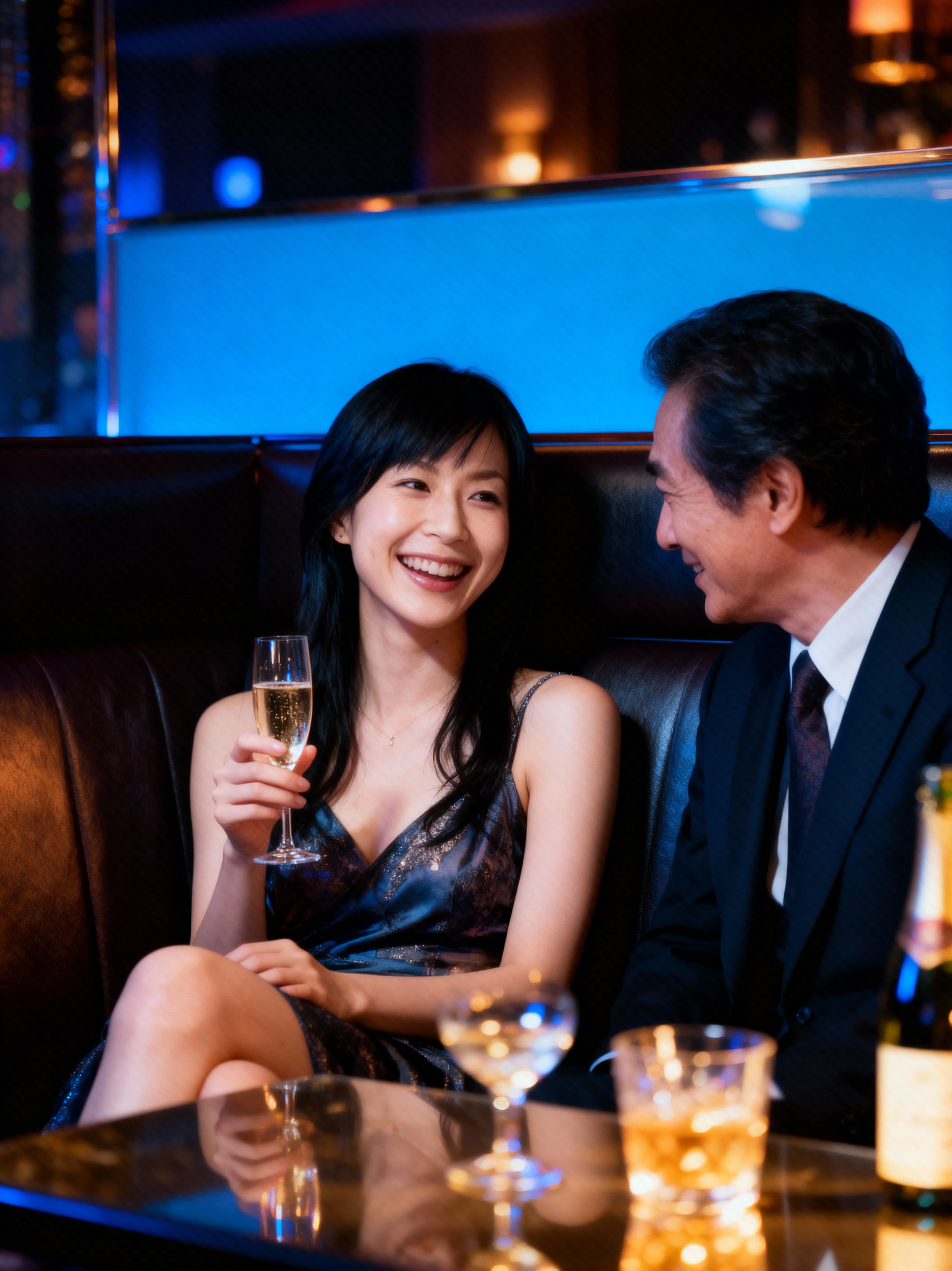薄暗いレストランでシャンパンを楽しむカップルを横から撮影した写実的な写真。この画像には、長い黒髪の若いアジア人女性が画像の中央にある革製のソファに座り、スリムな体と大きな胸を強調するノースリーブの銀色のドレスを着ています。彼女は歯を見せて満面の笑みを浮かべ、右手にシャンパングラスを持っています。彼女の左手は目の前のテーブルの上に置かれています。ソファの右側には、短い黒髪の男性が注意深く座り、笑顔で彼女を見つめています。彼はダークスーツに白いシャツと栗色のネクタイを着ています。背景はぼやけていますが、後ろにブルースクリーンがあり、居心地の良い雰囲気を作り出している屋内バーの設定のように見えます。照明は柔らかく温かみがあり、カップル間の親密な瞬間を強調しています。