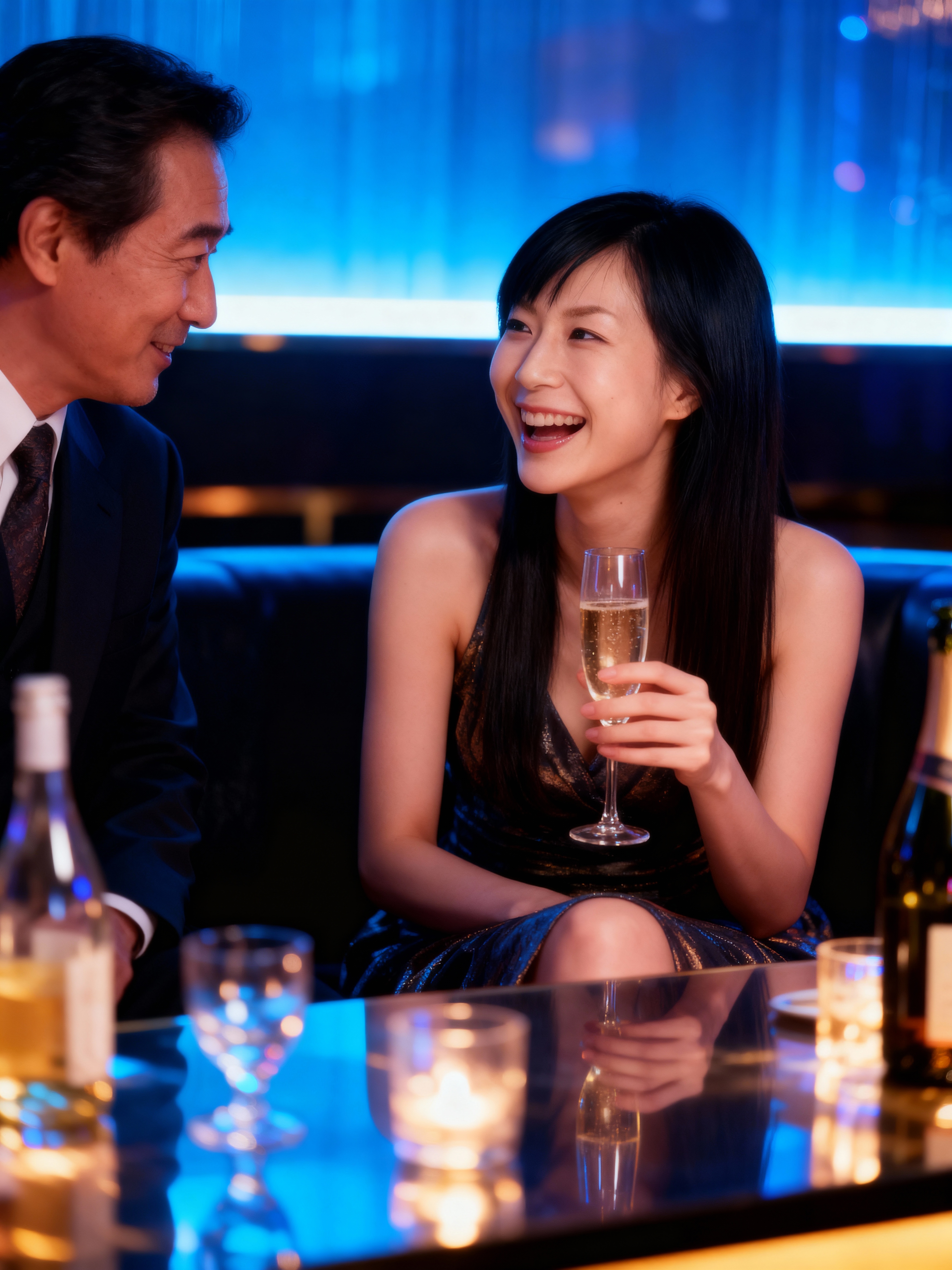 薄暗いバーのカウンターでシャンパンを楽しむカップルのロマンチックなシーン。銀のドレスを着た長い黒髪の若い女性が像の中央に座り、右手にシャンパングラスを持ち、お祝いの表情で口を開けて大きく微笑んでいる。彼女は20代半ばに見え、色白でほっそりした体格をしており、最小限の化粧と控えめな笑顔を浮かべています。彼女の左側には、短い黒髪の男性が注意深く座っており、わずかな笑みを浮かべながら彼女を注意深く見ています。彼はダークスーツに白いシャツと柄のネクタイを着ており、顔を女性の方に向け、あごを女性の肩に乗せています。彼は目を閉じており、顔にはリラックスした表情を浮かべています。背景はぼやけていますが、背景に青と紫の抽象的なパターンが見え、シーンのロマンチックな雰囲気を高めています。バーカウンターはガラスとアルコールのボトルでできており、温かく居心地の良い雰囲気を作り出しています。照明は柔らかく温かみがあり、カップルの顔や表情に焦点を当てており、居心地の良い親密な雰囲気を醸し出しています。