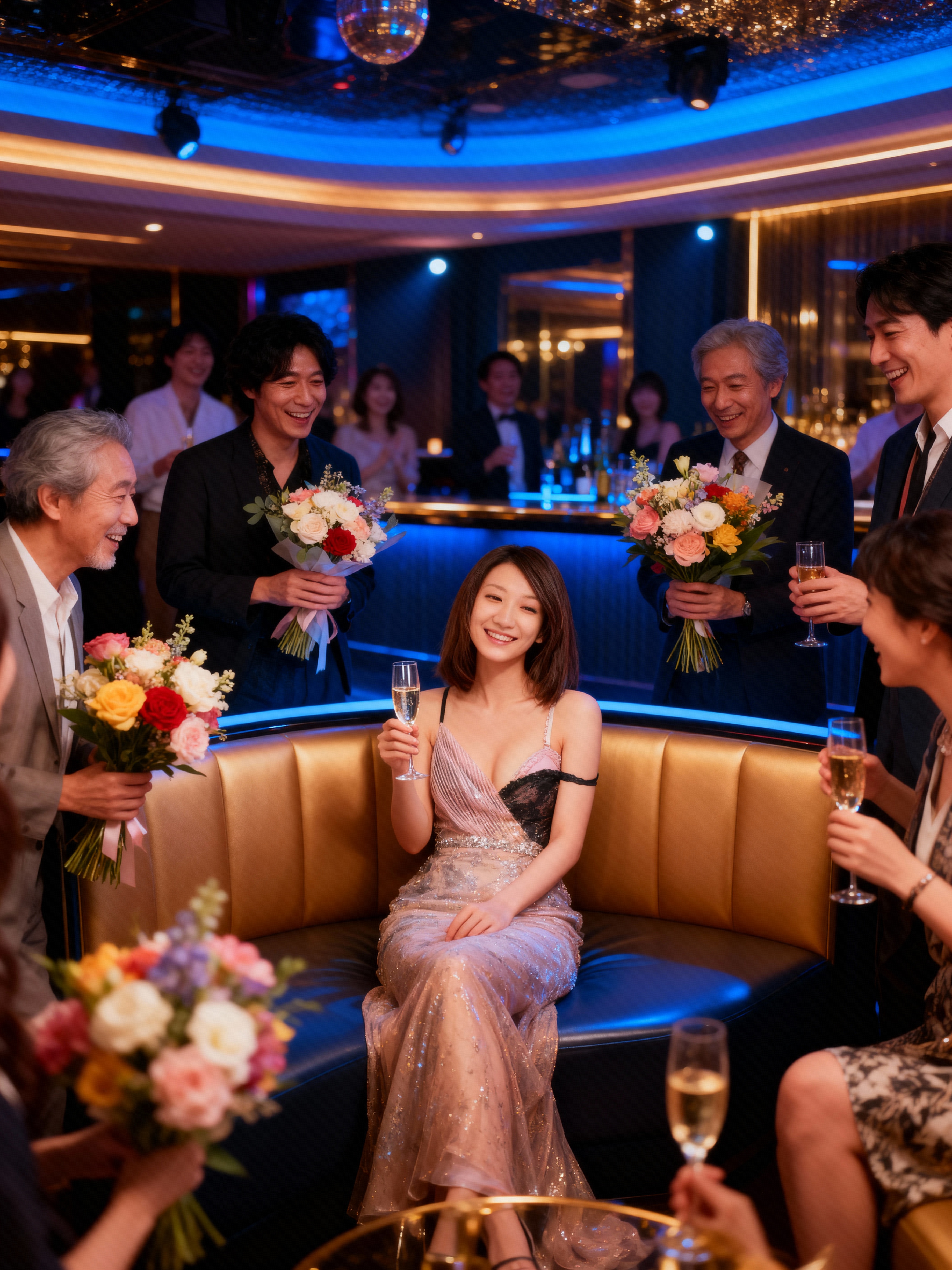 ブルーとゴールドの照明で彩られた豪華な部屋で、シャンパンで乾杯する人々を正面から写実的に撮影。画像中央のソファに座る女性は、胸元が大きく開いて肩が露出した、きらめくピンクのロングガウンを着ている。彼女は長い茶色の髪を持ち、手にシャンパンのグラスを持って満面の笑みを浮かべています。彼女の左側にはグレーのスーツを着た男性が花束を持っており、彼女の右側には別の男性が花束を持っている。背景では、ゲストがバーカウンターの周りに集まり、お祝いの雰囲気を楽しんでいます。部屋は薄暗く、天井からミラーボールがぶら下がっており、暖かく魅力的な雰囲気を作り出しています。