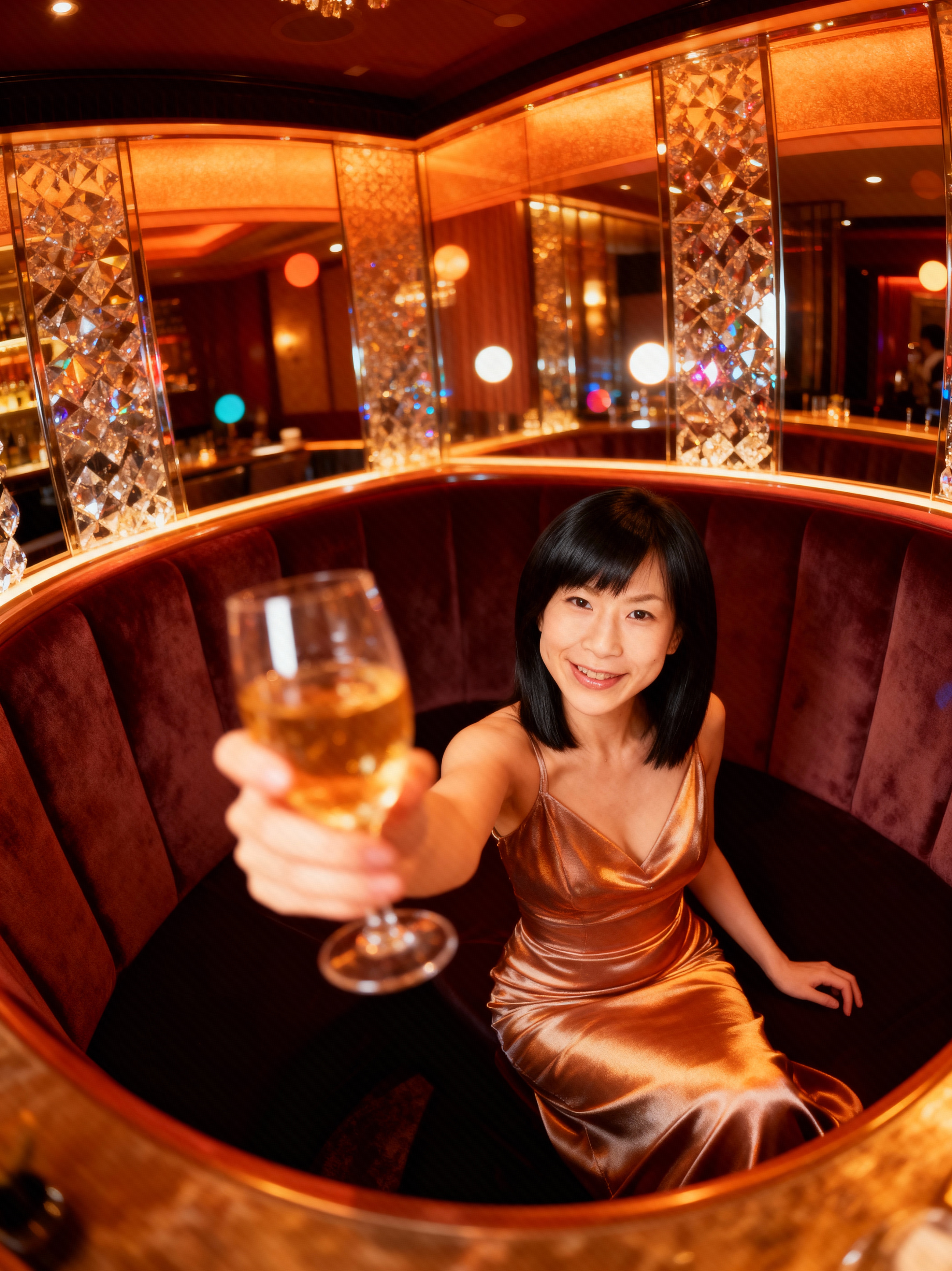 豪華なブースに座ってシャンパングラスを持った女性をローアングルから撮影した写実的なショット。 20代半ばと思われる女性は、スリムな体型を強調する光沢のあるオレンジ色のサテンのドレスを着てブースの中央に座っている。彼女の長くてまっすぐな黒髪は背中に流れ、彼女の顔を完璧に縁取っています。彼女は満面の笑みを浮かべており、目は視聴者をまっすぐに見つめ、唇はふざけて上向きに反っています。彼女の右手には金色の液体が満たされたグラスがあり、それを持ってセルフィーを撮っています。ブース自体はダイヤモンド模様のガラスパネルで装飾されており、背景は温かみのある金色の照明で薄暗く、居心地の良い雰囲気を作り出しています。全体的な印象は洗練さと優雅さを兼ね備えており、お祝いの瞬間に最適です。