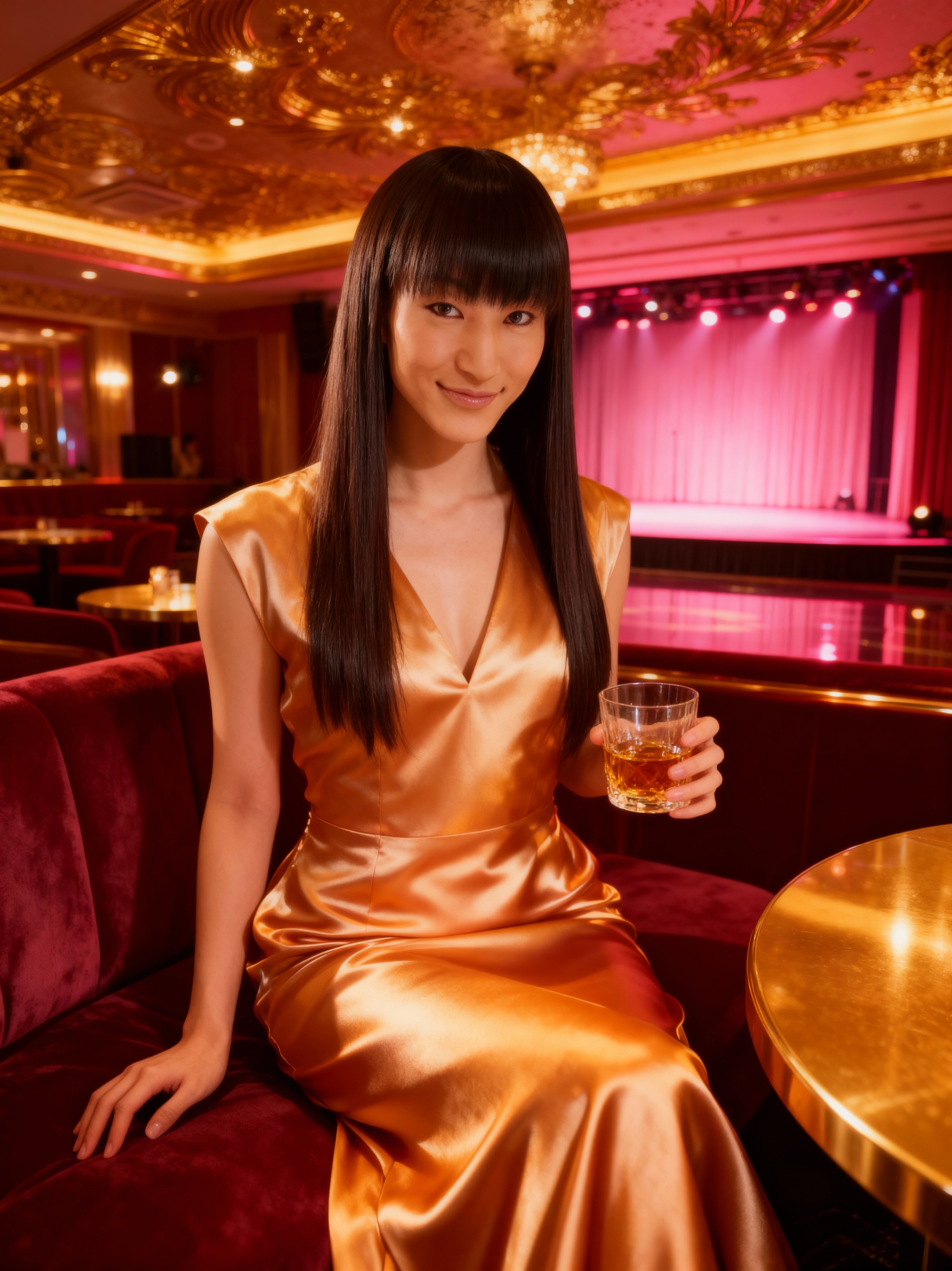 高級レストランの赤いベルベットのソファに座り、ウィスキーのグラスを持った女性を正面から写実的に撮影したもの。 20代半ばと思われる女性は、暗褐色のストレートなロングヘアで、前髪が顔を縁取っている。彼女は、彼女のスリムなボディと繊細な特徴を強調する、光沢のあるオレンジ色のサテンのドレスを着ています。彼女の茶色の目は視聴者をまっすぐに見つめており、口元にはわずかな笑みが浮かんでいます。画像の背景は薄暗く、ピンクのカーテンとゴールドのアクセントが施された華やかな部屋で、暖かく魅力的な雰囲気を作り出しています。照明は柔らかく温かみがあり、レストランの豪華なインテリアを際立たせています。