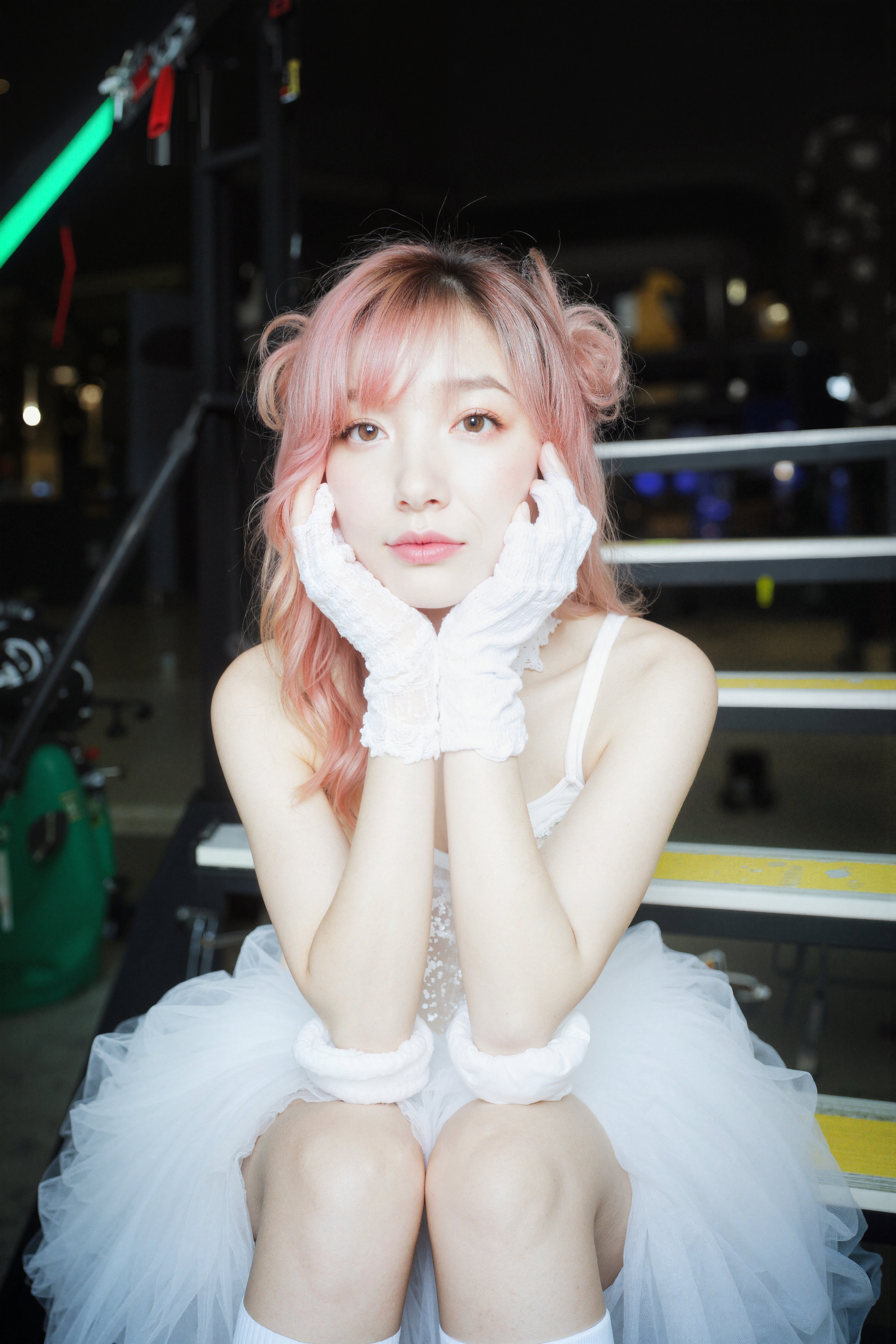 白いチュチュと白い手袋を身に着け、ボクシングのリングのベンチに座っているピンクの髪の若い女性を正面カメラのアングルから写実的に撮影したもの。この画像には、背景に柔らかい照明とぼやけた機器も示されています。画像の中央では、19歳のアジア人女性が顔の前で手を組んで座り、中立的な表情でカメラを直接見つめているように見える。彼女は白い肌、二つのおさげにまとめたピンクの髪、そして茶色の目をしています。彼女の服装は、白いドレスにチュールスカート、白いニーハイソックスです。彼女の手は白い手袋で覆われており、彼女の外観に優雅さを加えています。