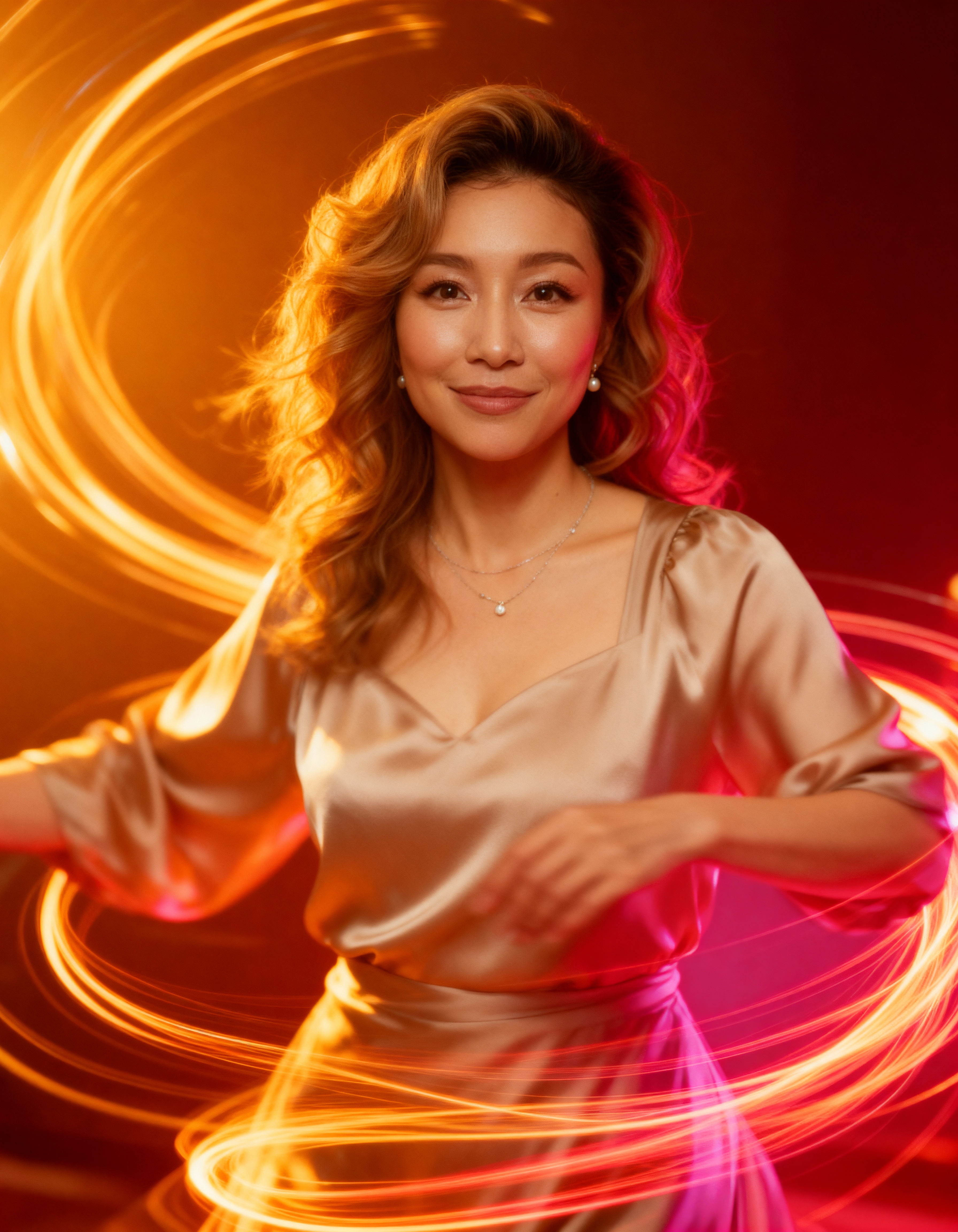 ウェーブのかかった茶色の長い髪を持ち、絹のようなベージュのドレスを着た中年のアジア人女性が腕をわずかに伸ばしてフレームの中央に立ち、オレンジとピンクの渦巻く光跡に囲まれた写真のようにリアルなポートレート。女性は40代後半か50代前半に見え、肌は白く、目は茶色で、顔には穏やかな笑みを浮かべています。彼女は小さなダイヤモンドのペンダントが付いた繊細なネックレスを身に着けており、フォーマルな服装にエレガントなタッチを加えています。背景は赤とオレンジのグラデーションで、女性のドレスの温かみのある色調と魅惑的なコントラストを生み出しています。照明は柔らかく温かみがあり、彼女の特徴を強調し、動きとエネルギーの感覚を生み出し、渦巻く光跡が彼女の背後に魅惑的な効果を生み出します。