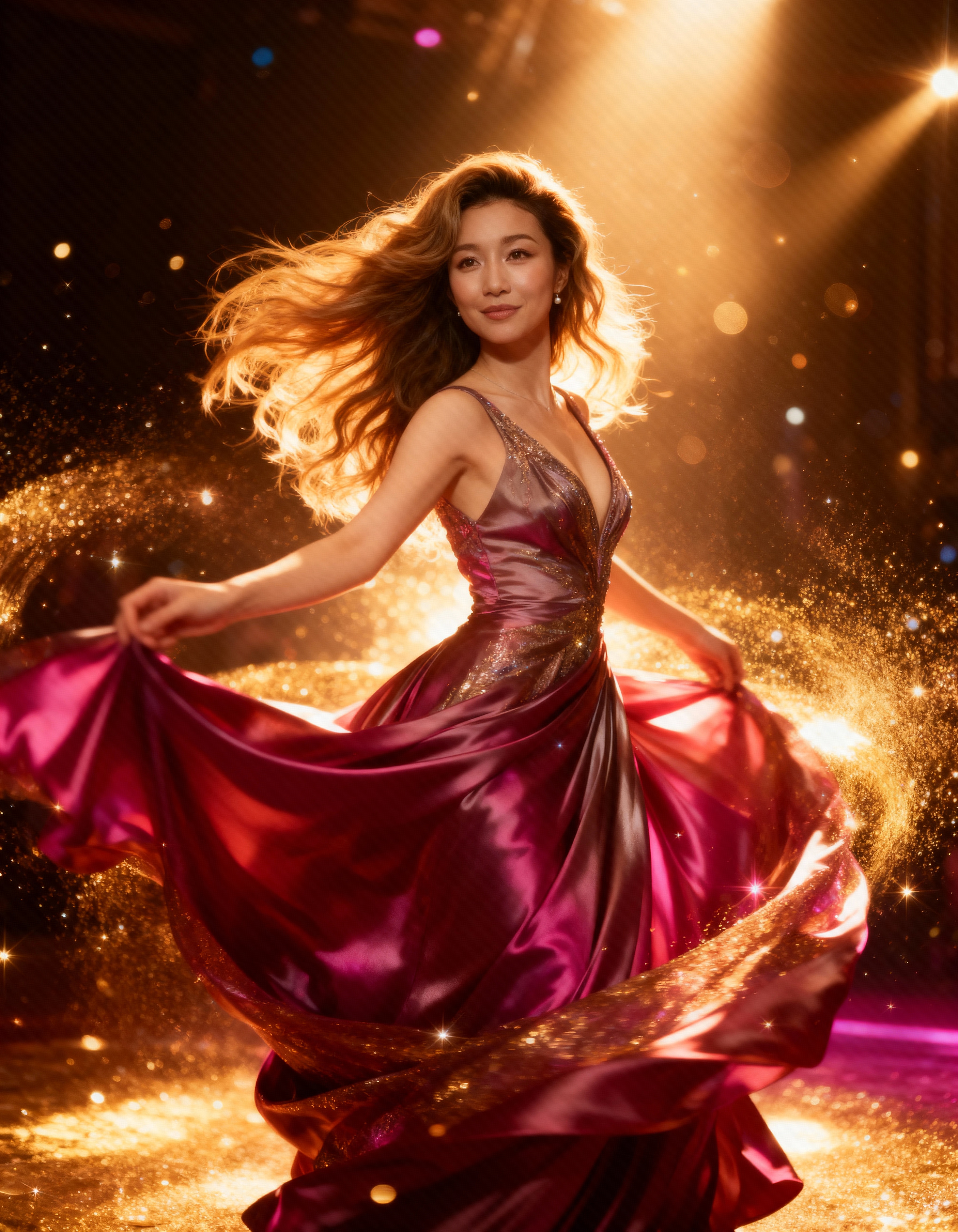 流れるようなきらめくドレスを着た美しい女性が、金色のライトと輝きを背景にステージ上で優雅に踊る様子を、正面カメラのアングルから写実的に撮影したものです。画像には、フレームの中央に20代半ばと思われる女性も写っており、ウェーブのかかった茶色の長い髪が背中に流れ落ちている。彼女は深いVネックでノースリーブのバーガンディのイブニングドレスを着ており、光の中で輝くゴールドのスパンコールが付いています。ガウンが風になびき、動きとエネルギーの感覚を生み出します。女性は腕を体の横に置き、足を少し開いて、まるで踊っているかのように立っています。彼女は自信に満ちた魅力的な表情を浮かべており、カメラを直接見つめています。彼女の茶色の髪はゆるやかなウェーブでスタイリングされ、顔を縁取っています。背景は暗く、スポットライトが明るく輝いており、幻想的な雰囲気を作り出しています。照明はドラマチックで、女性の優雅な動きとドレスのきらめく効果を強調しています。