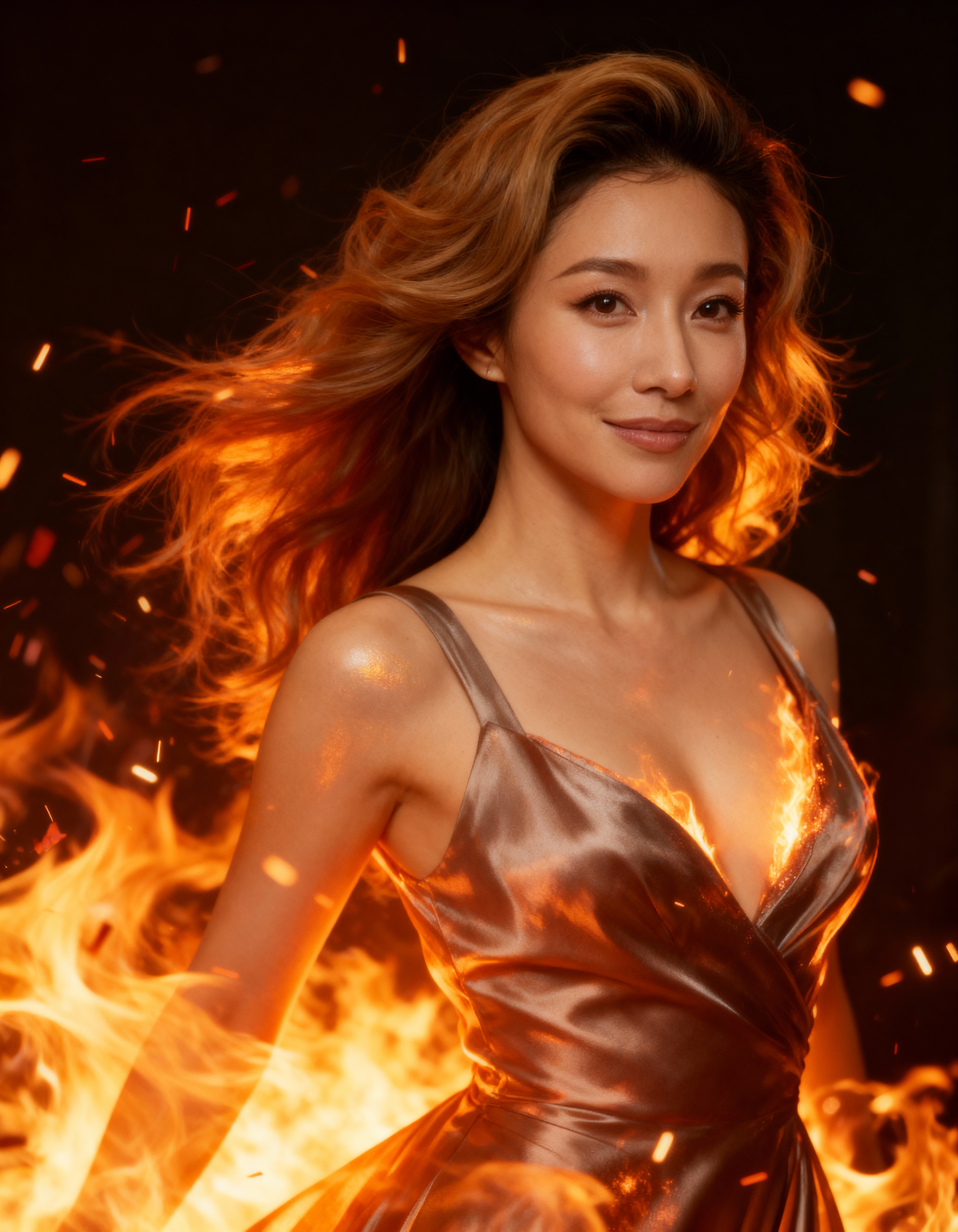 燃えるような背景の前に立つ、長くウェーブのかかった燃えるような髪を持つ美しい女性を、ポートレート カメラの角度から撮影した写実的なポートレート。画像には、フレームの中央に、色白の肌、茶色の目、わずかに笑みを浮かべた、20代後半と思われる女性も写っています。彼女は彼女のスリムな体型と深いVネックラインを強調する光沢のあるオレンジ色のサテンのドレスを着ており、細いストラップと大きく開いたネックラインが裸の肩を誇示しています。彼女の髪はゆるやかなウェーブに整えられ、背中に流れて顔を縁取ります。彼女の茶色の目は視聴者をまっすぐに見つめており、唇にはわずかに笑いを浮かべています。女性は腕を脇に置き、肘のところでわずかに曲げたダイナミックなポーズで立っており、動きとエネルギーの感覚を生み出しています。背景は暗くぼやけており、彼女の周りには火花と炎があり、画像に劇的な効果を加えています。照明はドラマチックで、彼女の特徴と燃えるような背景を強調し、画像をまるで本物のように魅力的に感じさせます。